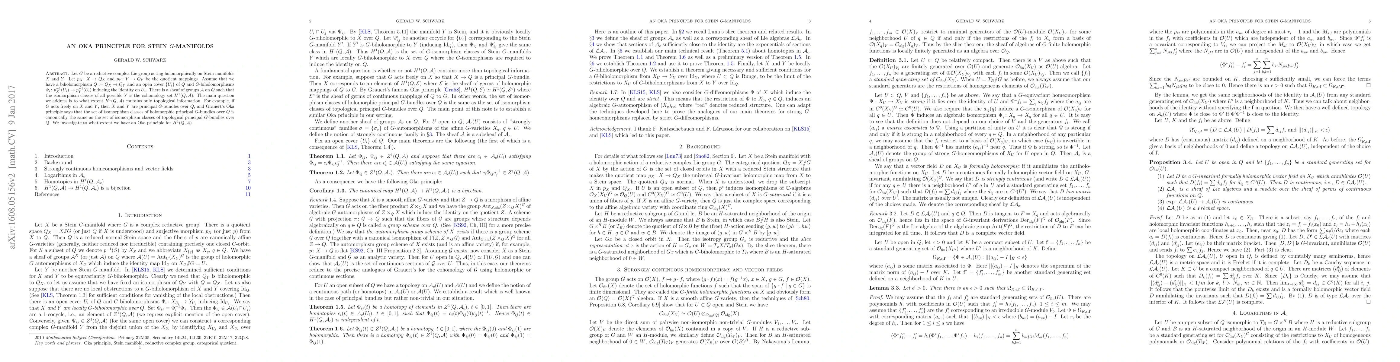Let $G$ be a reductive complex Lie group acting holomorphically on Stein manifolds $X$ and $Y$. Let $p_X\colon X\to Q_X$ and $p_Y\colon Y\to Q_Y$ be the quotient mappings. Assume that we have a biholomorphism $Q:= Q_X\to Q_Y$ and an open cover $\{U_i\}$ of $Q$ and $G$-biholomorphisms $\Phi_i\colon p_X^{-1}(U_i)\to p_Y^{-1}(U_i)$ inducing the identity on $U_i$. There is a sheaf of groups $\mathcal A$ on $Q$ such that the isomorphism classes of all possible $Y$ is the cohomology set $H^1(Q,\mathcal A)$. The main question we address is to what extent $H^1(Q,\mathcal A)$ contains only topological information. For example, if $G$ acts freely on $X$ and $Y$, then $X$ and $Y$ are principal $G$-bundles over $Q$, and Grauert's Oka Principle says that the set of isomorphism classes of holomorphic principal $G$-bundles over $Q$ is canonically the same as the set of isomorphism classes of topological principal $G$-bundles over $Q$. We investigate to what extent we have an Oka principle for $H^1(Q,\mathcal A)$.