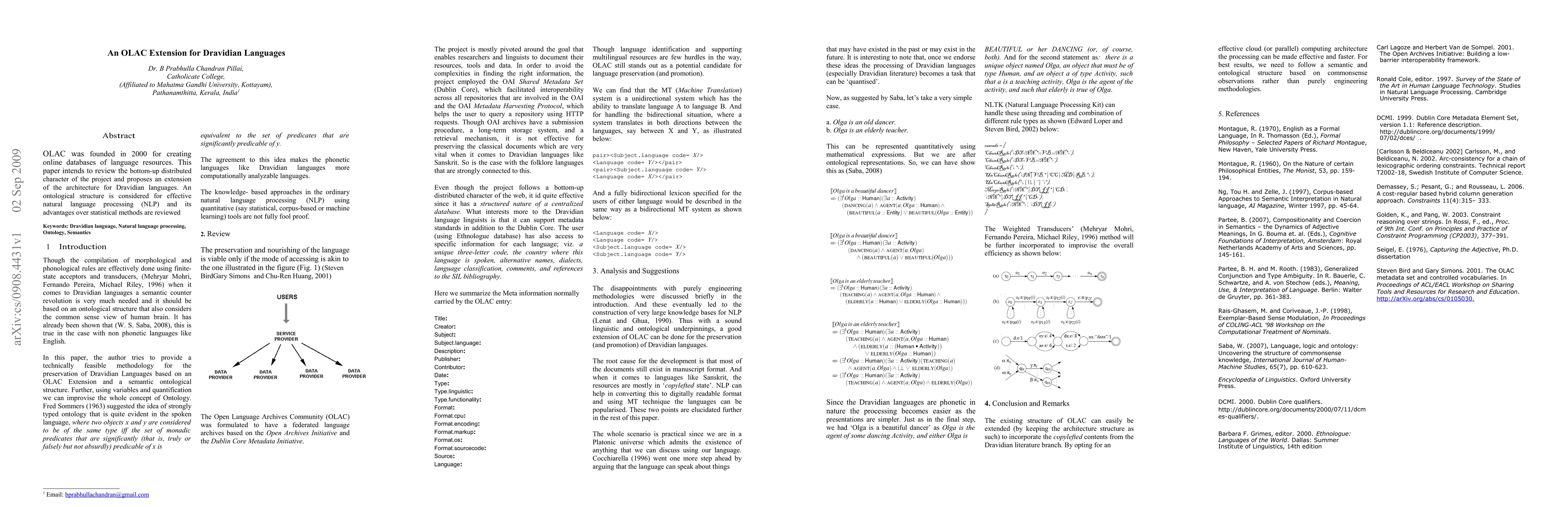 OLAC was founded in 2000 for creating online databases of language resources. This paper intends to review the bottom-up distributed character of the project and proposes an extension of the architecture for Dravidian languages. An ontological structure is considered for effective natural language processing (NLP) and its advantages over statistical methods are reviewed