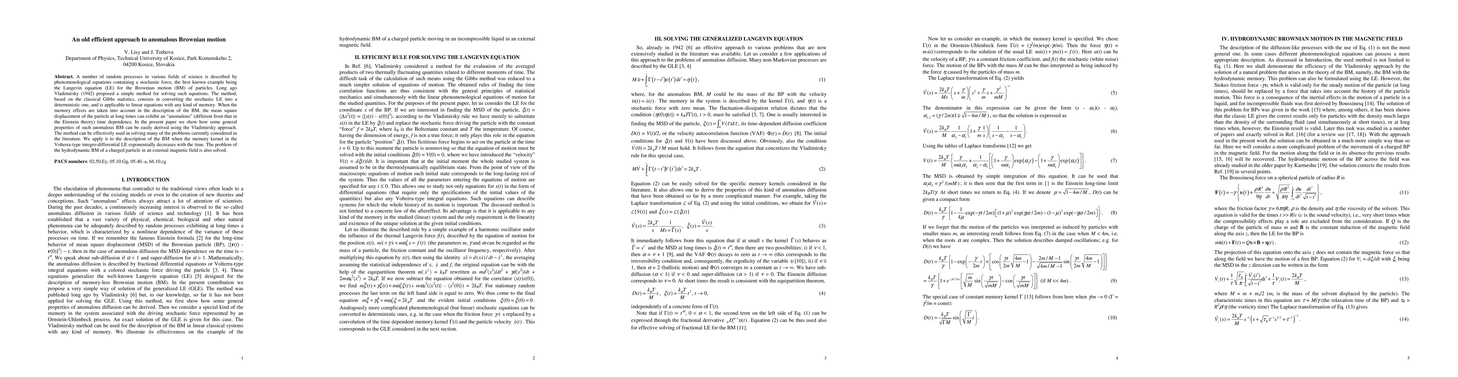 A number of random processes in various fields of science is described by phenomenological equations containing a stochastic force, the best known example being the Langevin equation (LE) for the Brownian motion (BM) of particles. Long ago Vladimirsky (1942) proposed a simple method for solving such equations. The method, based on the classical Gibbs statistics, consists in converting the stochastic LE into a deterministic one, and is applicable to linear equations with any kind of memory. When the memory effects are taken into account in the description of the BM, the mean square displacement of the particle at long times can exhibit an "anomalous" (different from that in the Einstein theory) time dependence. In the present paper we show how some general properties of such anomalous BM can be easily derived using the Vladimirsky approach. The method can be effectively used in solving many of the problems currently considered in the literature. We apply it to the description of the BM when the memory kernel in the Volterra-type integro-differential LE exponentially decreases with the time. The problem of the hydrodynamic BM of a charged particle in an external magnetic field is also solved.