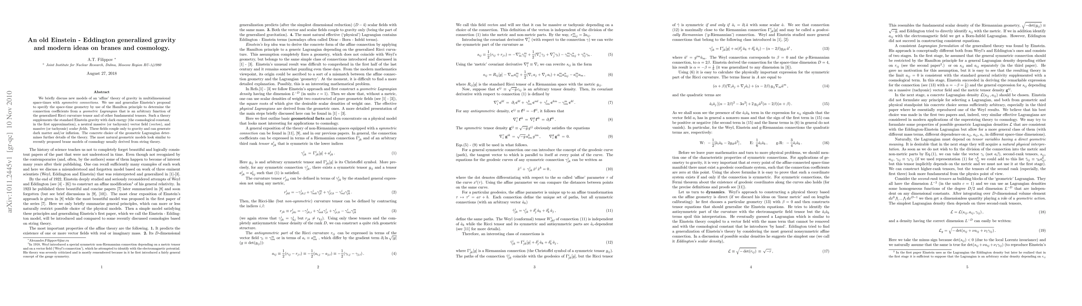 We briefly discuss new models of an `affine' theory of gravity in multidimensional space-times with symmetric connections. We use and generalize Einstein's proposal to specify the space-time geometry by use of the Hamilton principle to determine the connection coefficients from a geometric Lagrangian that is an arbitrary function of the generalized Ricci curvature tensor and of other fundamental tensors. Such a theory supplements the standard Einstein gravity with dark energy (the cosmological constant, in the first approximation), a neutral massive (or tachyonic) vector field vecton, and massive (or tachyonic) scalar fields. These fields couple only to gravity and can generate dark matter and/or inflation. The concrete choice of the geometric Lagrangian determines further details of the theory. The most natural geometric models look similar to recently proposed brane models of cosmology usually derived from string theory.