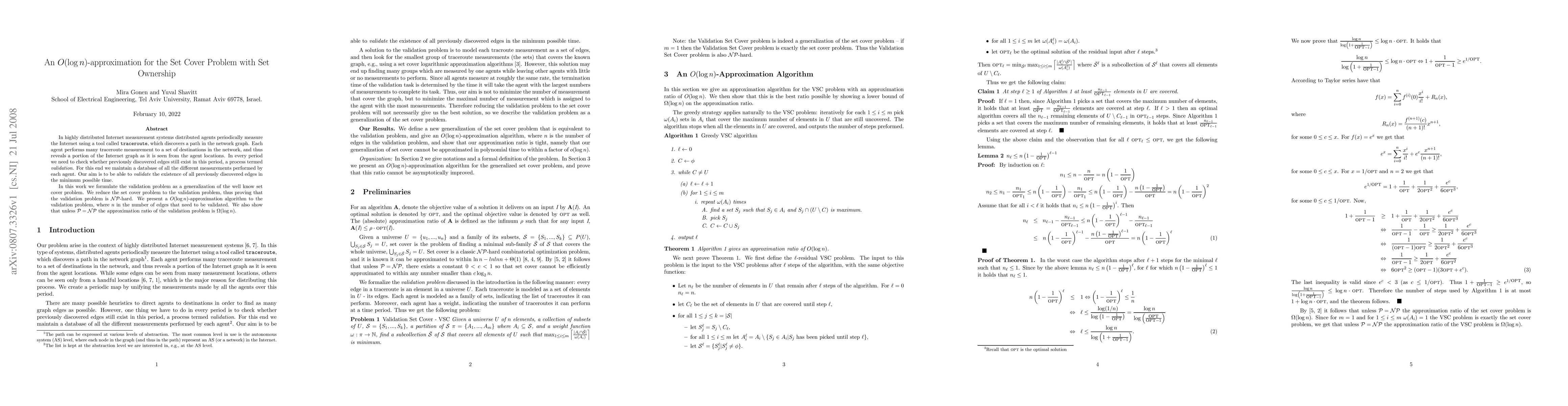In highly distributed Internet measurement systems distributed agents periodically measure the Internet using a tool called {\tt traceroute}, which discovers a path in the network graph. Each agent performs many traceroute measurement to a set of destinations in the network, and thus reveals a portion of the Internet graph as it is seen from the agent locations. In every period we need to check whether previously discovered edges still exist in this period, a process termed {\em validation}. For this end we maintain a database of all the different measurements performed by each agent. Our aim is to be able to {\em validate} the existence of all previously discovered edges in the minimum possible time. In this work we formulate the validation problem as a generalization of the well know set cover problem. We reduce the set cover problem to the validation problem, thus proving that the validation problem is ${\cal NP}$-hard. We present a $O(\log n)$-approximation algorithm to the validation problem, where $n$ in the number of edges that need to be validated. We also show that unless ${\cal P = NP}$ the approximation ratio of the validation problem is $\Omega(\log n)$.