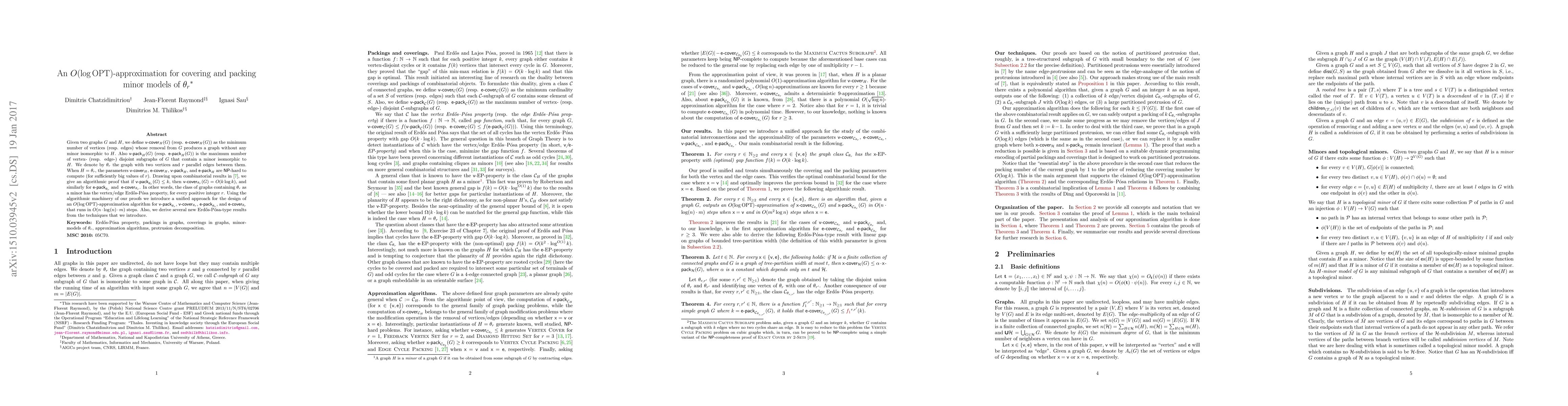Given two graphs $G$ and $H$, we define $\textsf{v-cover}_{H}(G)$ (resp. $\textsf{e-cover}_{H}(G)$) as the minimum number of vertices (resp. edges) whose removal from $G$ produces a graph without any minor isomorphic to ${H}$. Also $\textsf{v-pack}_{H}(G)$ (resp. $\textsf{v-pack}_{H}(G)$) is the maximum number of vertex- (resp. edge-) disjoint subgraphs of $G$ that contain a minor isomaorphic to $H$. We denote by $\theta_r$ the graph with two vertices and $r$ parallel edges between them. When $H=\theta_r$, the parameters $\textsf{v-cover}_{H}$, $\textsf{e-cover}_{H}$, $\textsf{v-pack}_{H}$, and $\textsf{v-pack}_{H}$ are NP-hard to compute (for sufficiently big values of $r$). Drawing upon combinatorial results in [Minors in graphs of large $\theta_r$-girth, Chatzidimitriou et al., arXiv:1510.03041], we give an algorithmic proof that if $\textsf{v-pack}_{\theta_r}(G)\leq k$, then $\textsf{v-cover}_{\theta_r}(G) = O(k\log k)$, and similarly for $\textsf{v-pack}_{\theta_r}$ and $\textsf{e-cover}_{\theta_r}$. In other words, the class of graphs containing ${\theta_r}$ as a minor has the vertex/edge Erd\H{o}s-P\'osa property, for every positive integer $r$. Using the algorithmic machinery of our proofs, we introduce a unified approach for the design of an $O(\log {\rm OPT})$-approximation algorithm for $\textsf{v-pack}_{\theta_r}$, $\textsf{v-cover}_{\theta_r}$, $\textsf{v-pack}_{\theta_r}$, and $\textsf{e-cover}_{\theta_r}$ that runs in $O(n\cdot \log(n)\cdot m)$ steps. Also, we derive several new Erd\H{o}s-P\'osa-type results from the techniques that we introduce.
