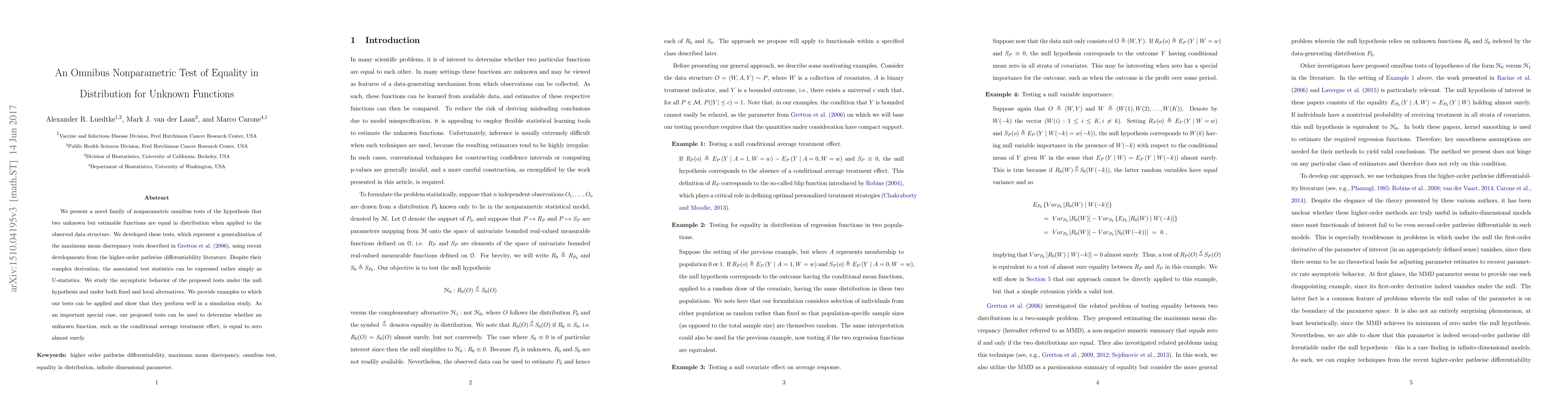 We present a novel family of nonparametric omnibus tests of the hypothesis that two unknown but estimable functions are equal in distribution when applied to the observed data structure. We developed these tests, which represent a generalization of the maximum mean discrepancy tests described in Gretton et al. [2006], using recent developments from the higher-order pathwise differentiability literature. Despite their complex derivation, the associated test statistics can be expressed rather simply as U-statistics. We study the asymptotic behavior of the proposed tests under the null hypothesis and under both fixed and local alternatives. We provide examples to which our tests can be applied and show that they perform well in a simulation study. As an important special case, our proposed tests can be used to determine whether an unknown function, such as the conditional average treatment effect, is equal to zero almost surely.