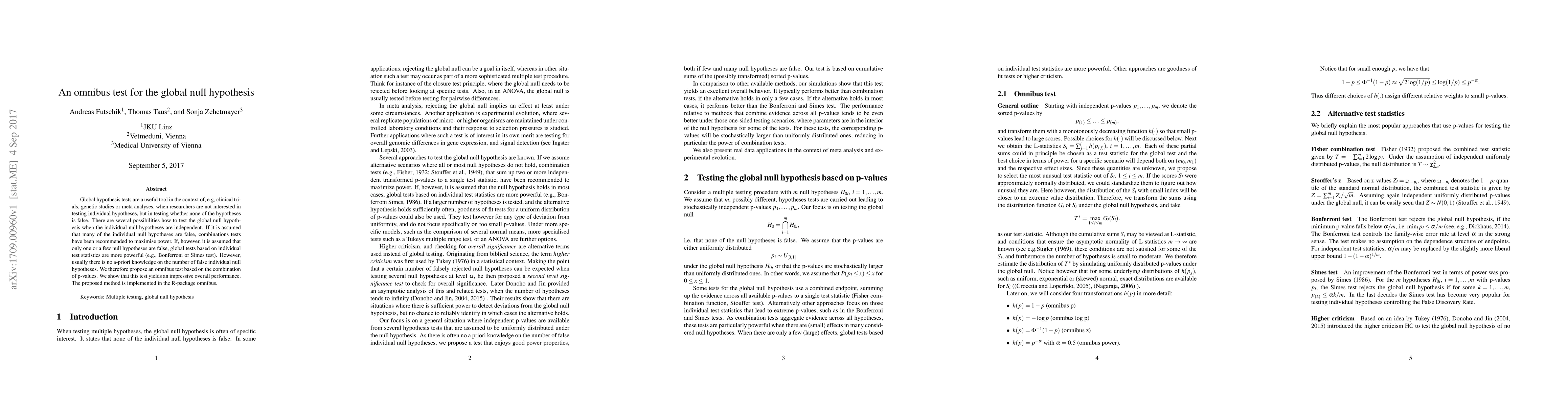 Global hypothesis tests are a useful tool in the context of, e.g, clinical trials, genetic studies or meta analyses, when researchers are not interested in testing individual hypotheses, but in testing whether none of the hypotheses is false. There are several possibilities how to test the global null hypothesis when the individual null hypotheses are independent. If it is assumed that many of the individual null hypotheses are false, combinations tests have been recommended to maximise power. If, however, it is assumed that only one or a few null hypotheses are false, global tests based on individual test statistics are more powerful (e.g., Bonferroni or Simes test). However, usually there is no a-priori knowledge on the number of false individual null hypotheses. We therefore propose an omnibus test based on the combination of p-values. We show that this test yields an impressive overall performance. The proposed method is implemented in the R-package omnibus.