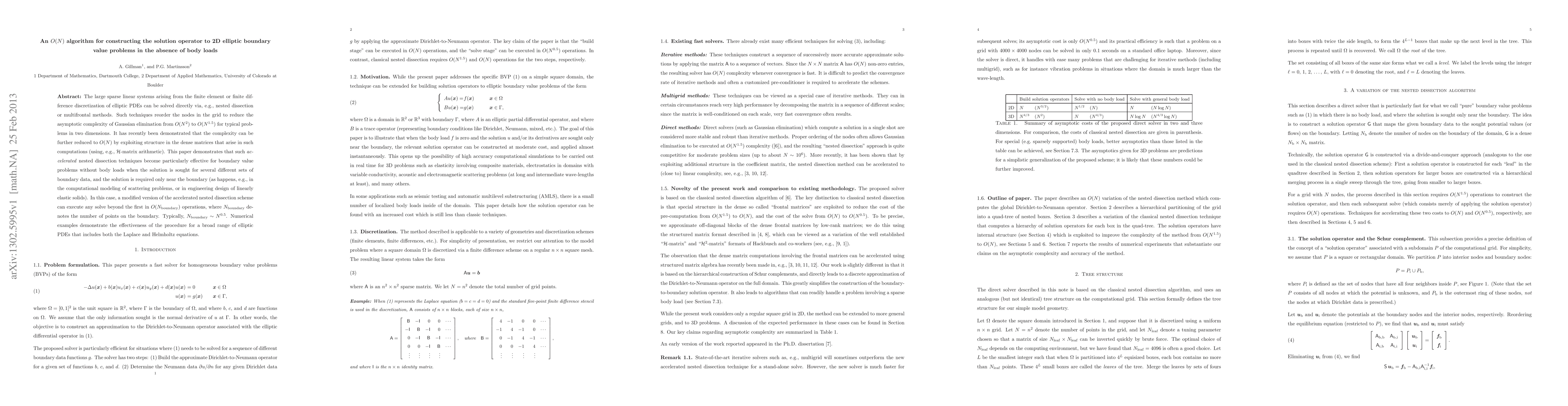 This paper presents an O(N) algorithm for solving 2D elliptic boundary value problems without body loads, leveraging accelerated nested dissection techniques to exploit the structure in dense matrices, achieving significant computational efficiency for problems requiring boundary-only solutions.