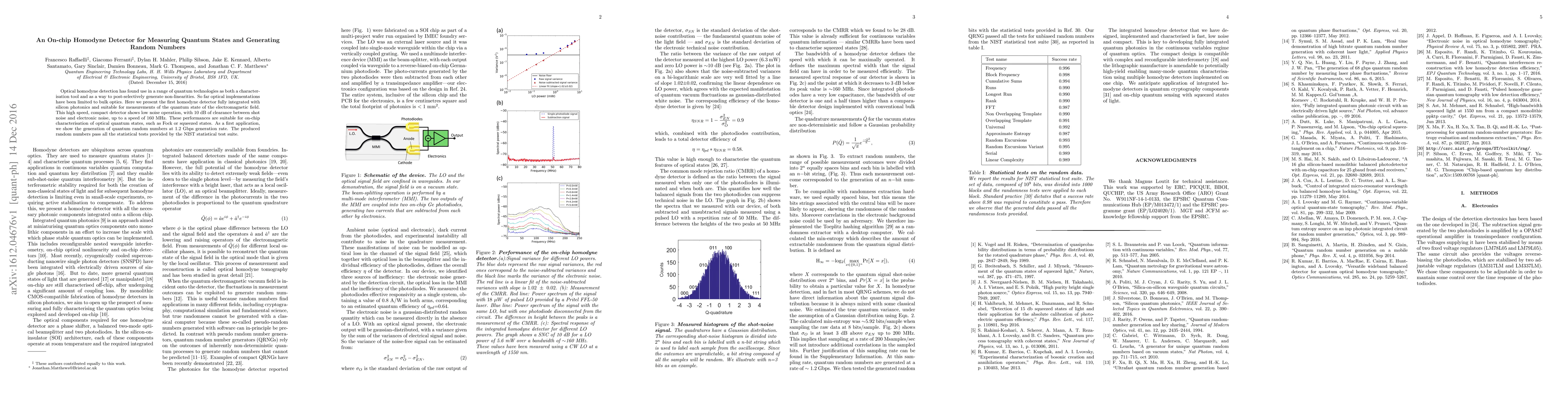 This paper presents the first fully integrated on-chip homodyne detector using silicon photonics for quantum state measurement and random number generation. The detector achieves low noise and high speed, enabling the characterization of optical quantum states and the generation of quantum random numbers at 1.2 Gbps, validated by NIST tests.
