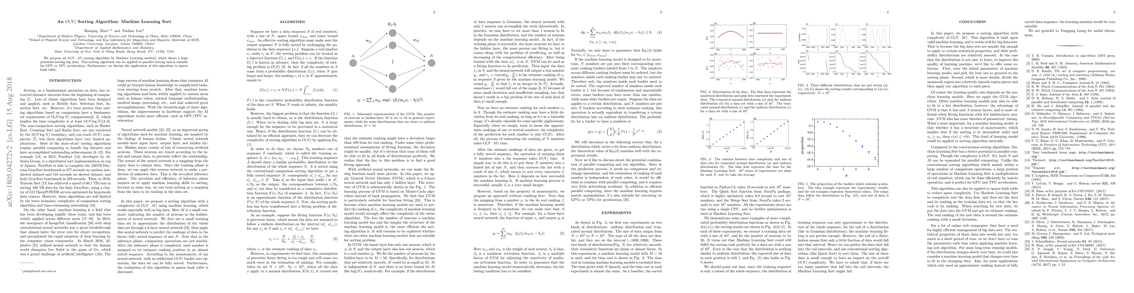 Summary: This paper introduces an $O(N \cdot M)$ sorting algorithm utilizing machine learning, demonstrating significant potential for large data sorting. The algorithm is suitable for parallel processing and can leverage GPU or TPU acceleration, with additional applications to sparse hash tables.