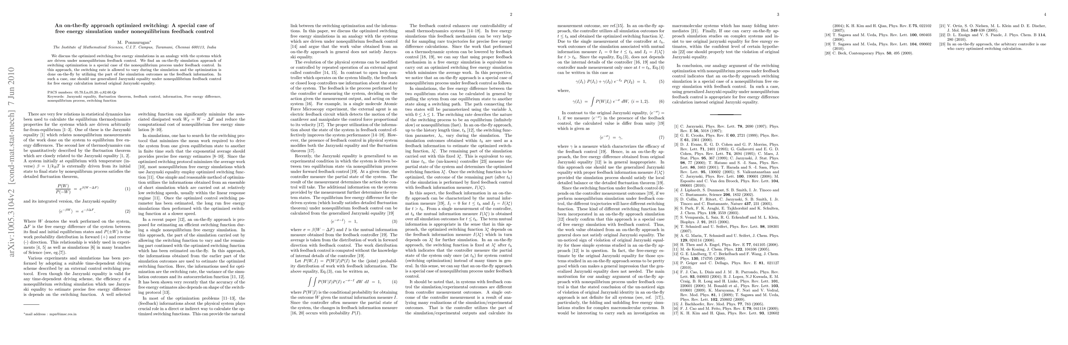 This paper explores optimized switching free energy simulations in systems driven by nonequilibrium feedback control, demonstrating that an on-the-fly approach for switching optimization is a special case of this nonequilibrium process. It uses generalized Jarzynski equality for free energy calculations instead of the original method.