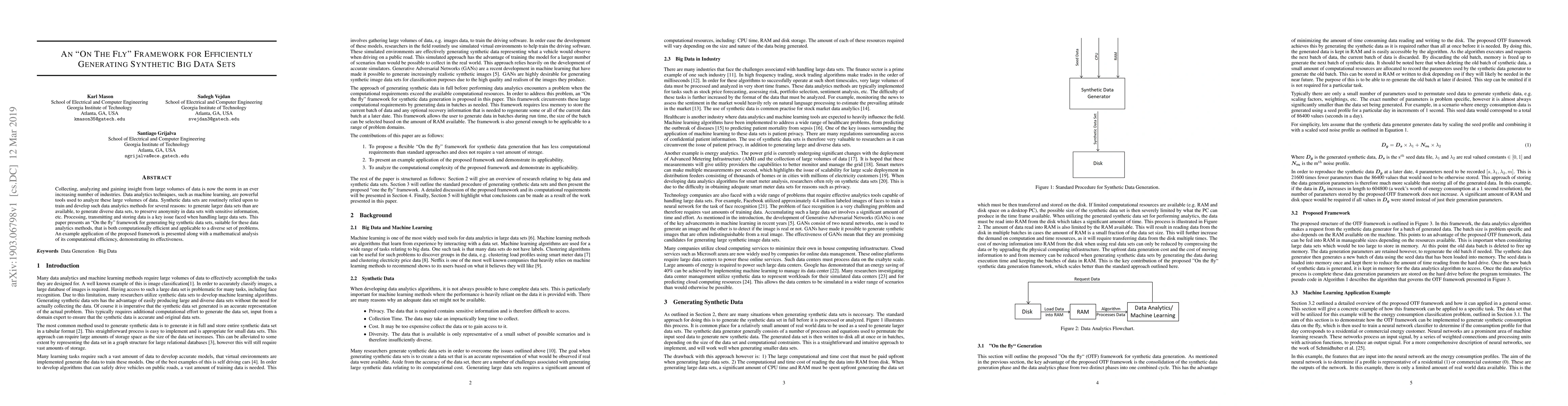 Collecting, analyzing and gaining insight from large volumes of data is now the norm in an ever increasing number of industries. Data analytics techniques, such as machine learning, are powerful tools used to analyze these large volumes of data. Synthetic data sets are routinely relied upon to train and develop such data analytics methods for several reasons: to generate larger data sets than are available, to generate diverse data sets, to preserve anonymity in data sets with sensitive information, etc. Processing, transmitting and storing data is a key issue faced when handling large data sets. This paper presents an "On the fly" framework for generating big synthetic data sets, suitable for these data analytics methods, that is both computationally efficient and applicable to a diverse set of problems. An example application of the proposed framework is presented along with a mathematical analysis of its computational efficiency, demonstrating its effectiveness.