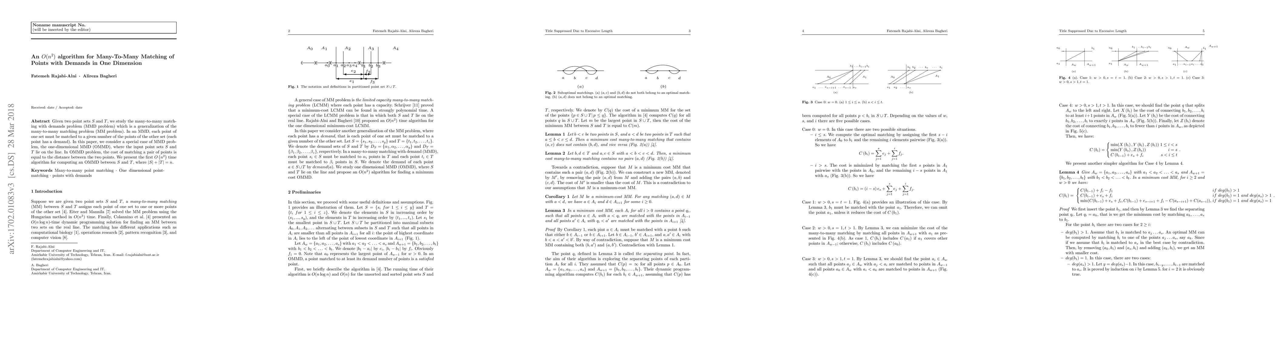 This paper presents an O(n^2) time algorithm for solving the one-dimensional many-to-many matching with demands (OMMD) problem, where each point in one set must match to a specified number of points in another set, and the cost is the Euclidean distance between points. This addresses a special case of the generalized MMD problem.