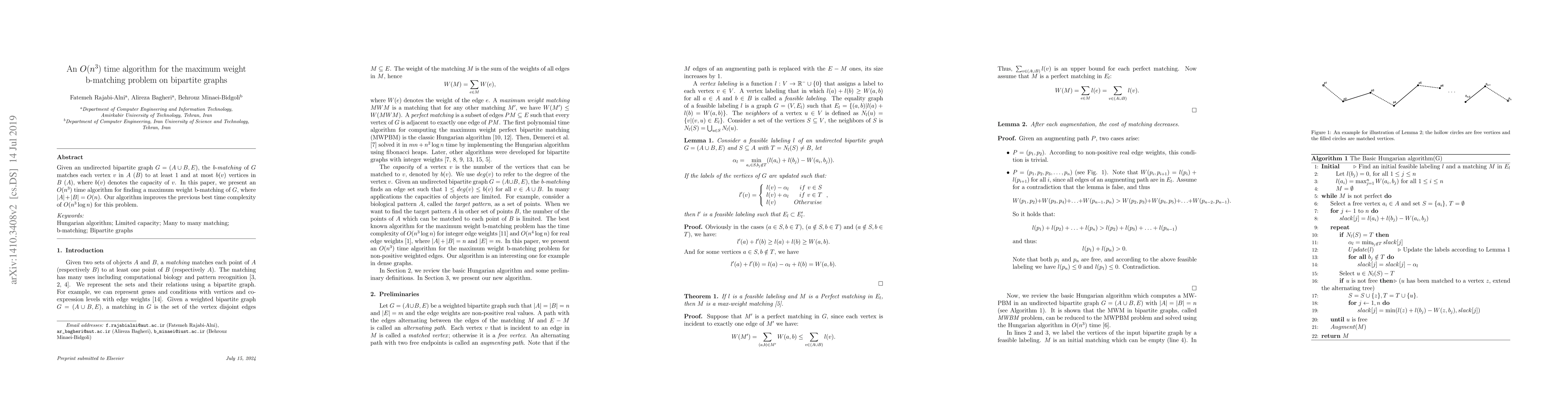 Given an undirected bipartite graph G= (A U B,E), the b-matching of G matches each vertex v in A (B) to at least 1 and at most b(v) vertices in B (A), where b(v) denotes the capacity of v. In this paper, we present an O(n^3) time algorithm for finding a maximum weight b-matching of G, where |A|+|B|=O(n). Our algorithm improves the previous best time complexity of O(n^3 log n) for this problem.