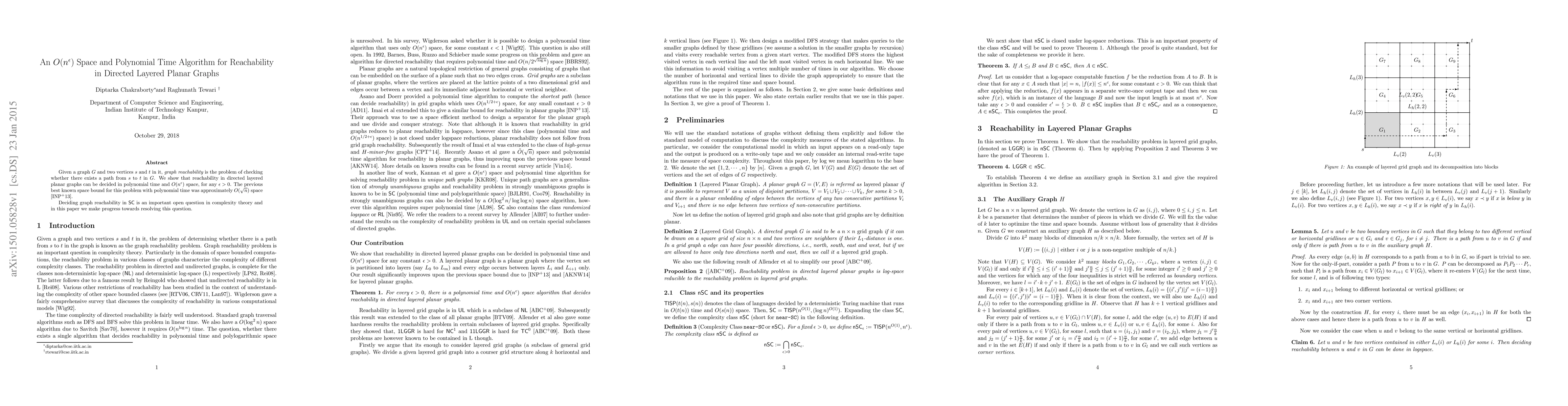 Summary: This paper presents a polynomial time algorithm with $O(n^\epsilon)$ space complexity for determining reachability in directed layered planar graphs, improving upon the previous best-known space bound of $O(\sqrt{n})$. The result advances the understanding of complexity theory for the SC class.