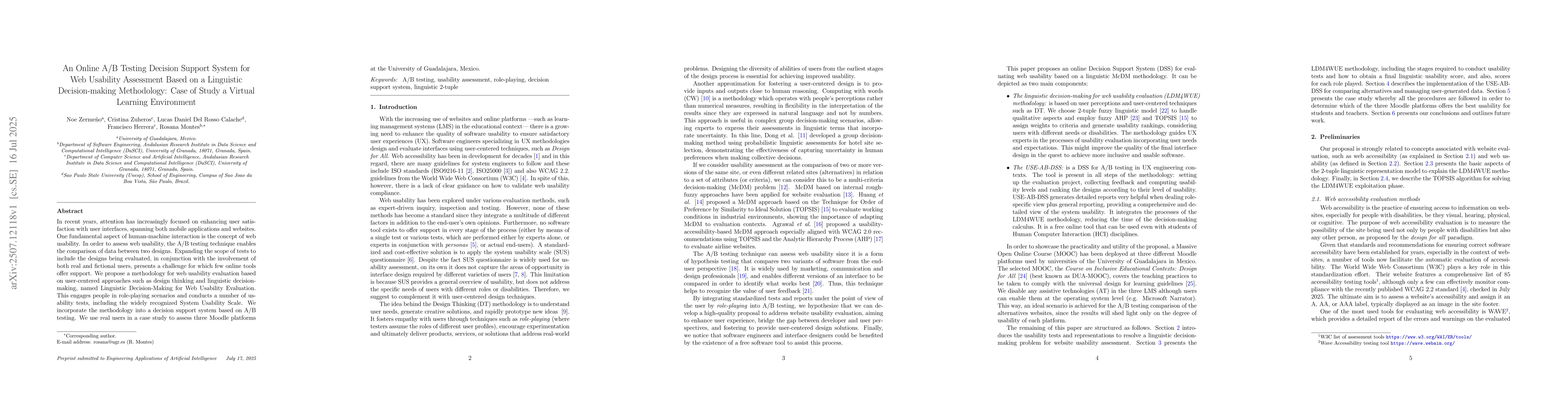 In recent years, attention has increasingly focused on enhancing user satisfaction with user interfaces, spanning both mobile applications and websites. One fundamental aspect of human-machine interaction is the concept of web usability. In order to assess web usability, the A/B testing technique enables the comparison of data between two designs. Expanding the scope of tests to include the designs being evaluated, in conjunction with the involvement of both real and fictional users, presents a challenge for which few online tools offer support. We propose a methodology for web usability evaluation based on user-centered approaches such as design thinking and linguistic decision-making, named Linguistic Decision-Making for Web Usability Evaluation. This engages people in role-playing scenarios and conducts a number of usability tests, including the widely recognized System Usability Scale. We incorporate the methodology into a decision support system based on A/B testing. We use real users in a case study to assess three Moodle platforms at the University of Guadalajara, Mexico.