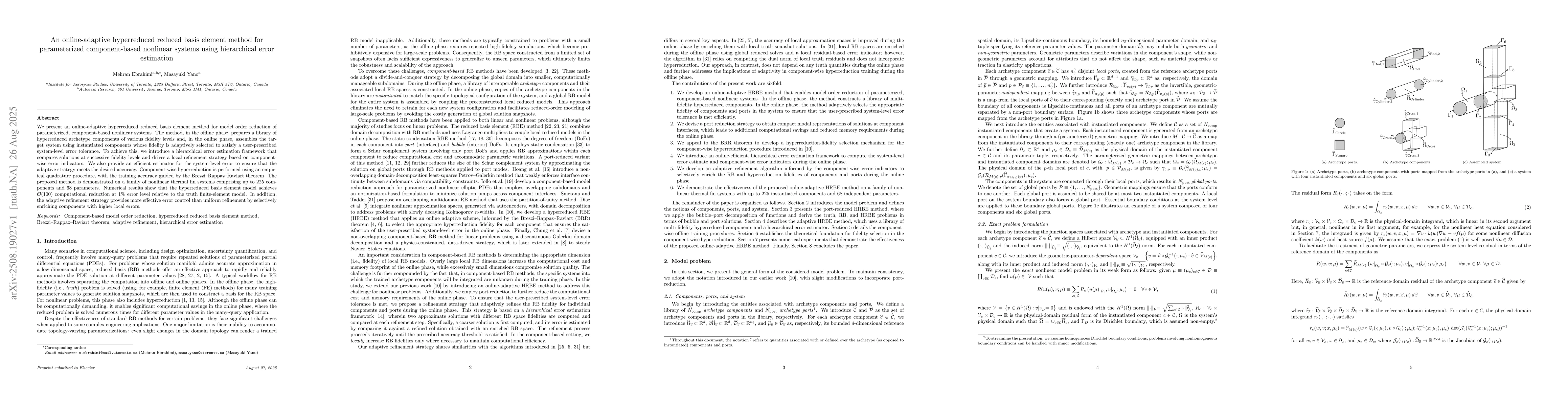 We present an online-adaptive hyperreduced reduced basis element method for model order reduction of parameterized, component-based nonlinear systems. The method, in the offline phase, prepares a library of hyperreduced archetype components of various fidelity levels and, in the online phase, assembles the target system using instantiated components whose fidelity is adaptively selected to satisfy a user-prescribed system-level error tolerance. To achieve this, we introduce a hierarchical error estimation framework that compares solutions at successive fidelity levels and drives a local refinement strategy based on component-wise error indicators. We also provide an efficient estimator for the system-level error to ensure that the adaptive strategy meets the desired accuracy. Component-wise hyperreduction is performed using an empirical quadrature procedure, with the training accuracy guided by the Brezzi--Rappaz--Raviart theorem. The proposed method is demonstrated on a family of nonlinear thermal fin systems comprising up to 225 components and 68 parameters. Numerical results show that the hyperreduced basis element model achieves O(100) computational reduction at 1% error level relative to the truth finite-element model. In addition, the adaptive refinement strategy provides more effective error control than uniform refinement by selectively enriching components with higher local errors.