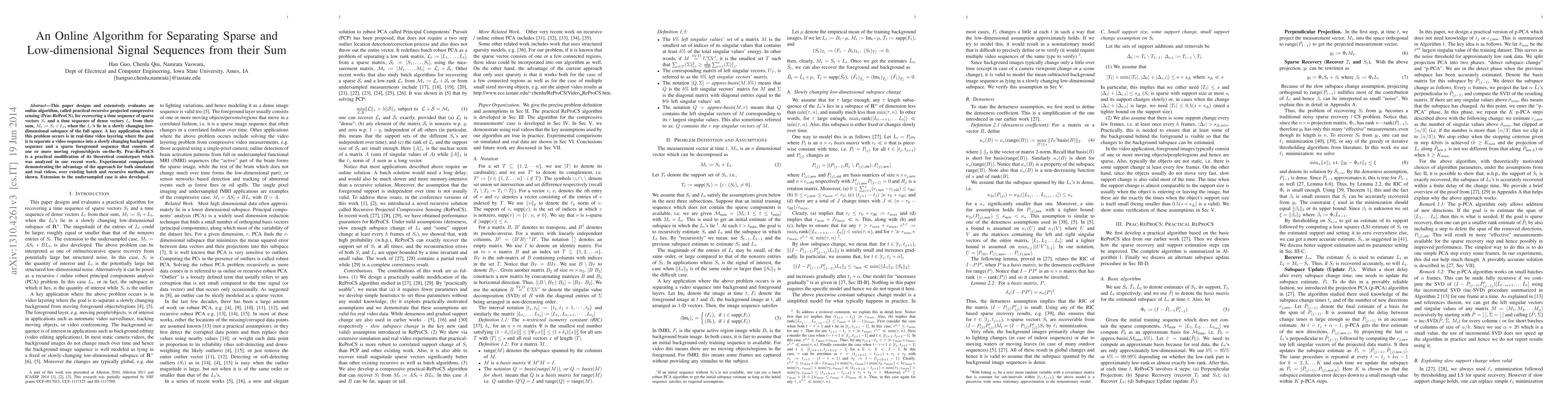 This paper designs and evaluates a practical algorithm, called practical recursive projected compressive sensing (Prac-ReProCS), for recovering a time sequence of sparse vectors $S_t$ and a time sequence of dense vectors $L_t$ from their sum, $M_t:= S_t + L_t$, when any subsequence of the $L_t$'s lies in a slowly changing low-dimensional subspace. A key application where this problem occurs is in video layering where the goal is to separate a video sequence into a slowly changing background sequence and a sparse foreground sequence that consists of one or more moving regions/objects. Prac-ReProCS is a practical modification of its theoretical counterpart which was analyzed in our recent work. Experimental comparisons demonstrating the advantage of the approach for both simulated and real videos are shown. Extension to the undersampled case is also developed.