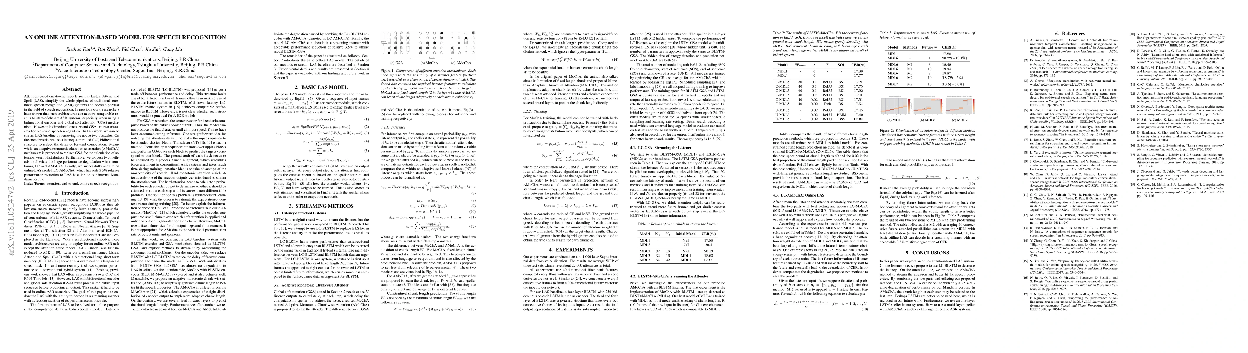This paper proposes an online attention-based model for speech recognition, utilizing a latency-controlled bidirectional encoder and adaptive monotonic chunk-wise attention to replace traditional components, achieving near-equivalent performance with reduced latency.
