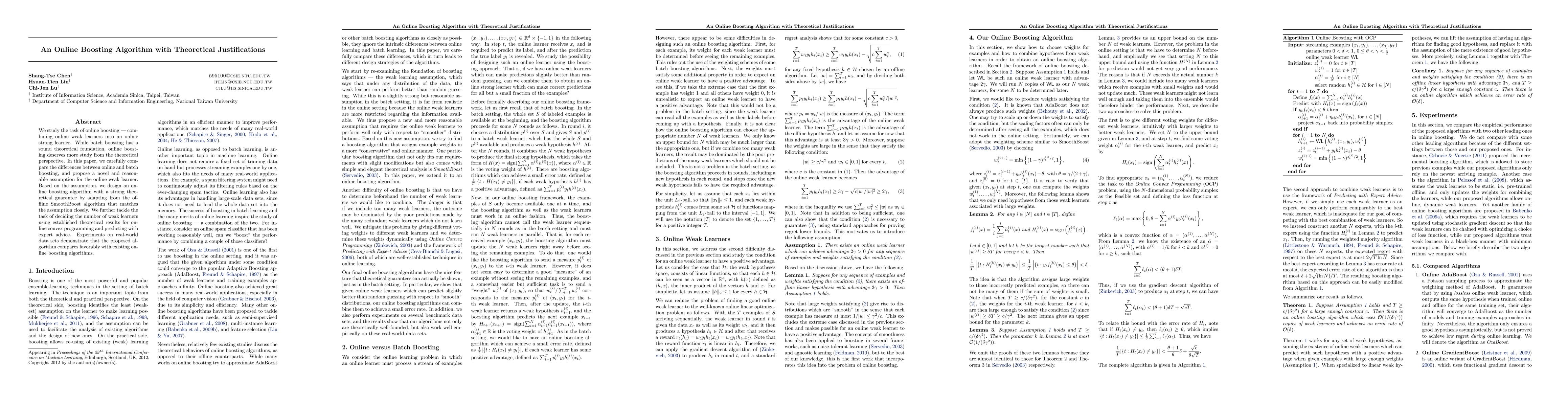 This paper proposes an online boosting algorithm with theoretical justifications by comparing online and batch boosting, introducing a novel assumption for online weak learners, and adapting the offline SmoothBoost algorithm. The algorithm is shown to perform competitively on real-world datasets.