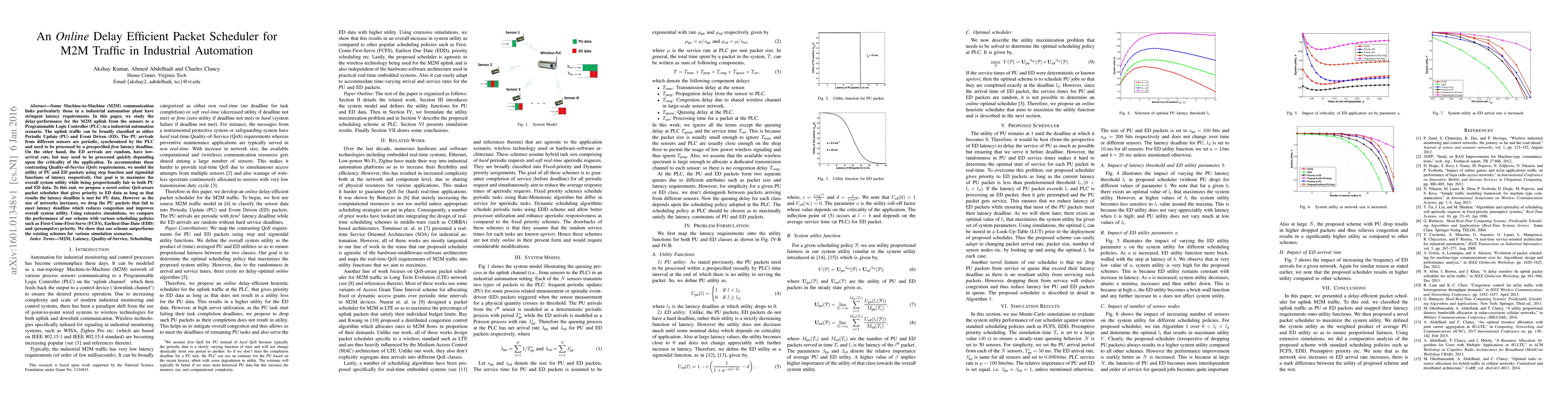 Some Machine-to-Machine (M2M) communication links particularly those in a industrial automation plant have stringent latency requirements. In this paper, we study the delay-performance for the M2M uplink from the sensors to a Programmable Logic Controller (PLC) in a industrial automation scenario. The uplink traffic can be broadly classified as either Periodic Update (PU) and Event Driven (ED). The PU arrivals from different sensors are periodic, synchronized by the PLC and need to be processed by a prespecified firm latency deadline. On the other hand, the ED arrivals are random, have low-arrival rate, but may need to be processed quickly depending upon the criticality of the application. To accommodate these contrasting Quality-of-Service (QoS) requirements, we model the utility of PU and ED packets using step function and sigmoidal functions of latency respectively. Our goal is to maximize the overall system utility while being proportionally fair to both PU and ED data. To this end, we propose a novel online QoS-aware packet scheduler that gives priority to ED data as long as that results the latency deadline is met for PU data. However as the size of networks increases, we drop the PU packets that fail to meet latency deadline which reduces congestion and improves overall system utility. Using extensive simulations, we compare the performance of our scheme with various scheduling policies such as First-Come-First-Serve (FCFS), Earliest-Due-Date (EDD) and (preemptive) priority. We show that our scheme outperforms the existing schemes for various simulation scenarios.