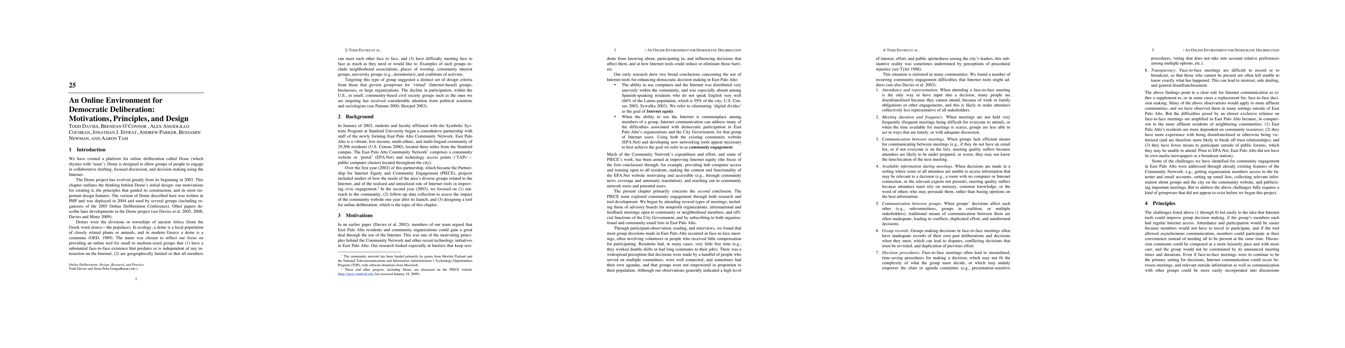 This paper describes the Deme platform, an online environment designed for democratic deliberation, outlining its motivations, guiding principles, and key design features. The platform, written in PHP and deployed in 2004, facilitated collaborative drafting, discussion, and decision-making among groups.