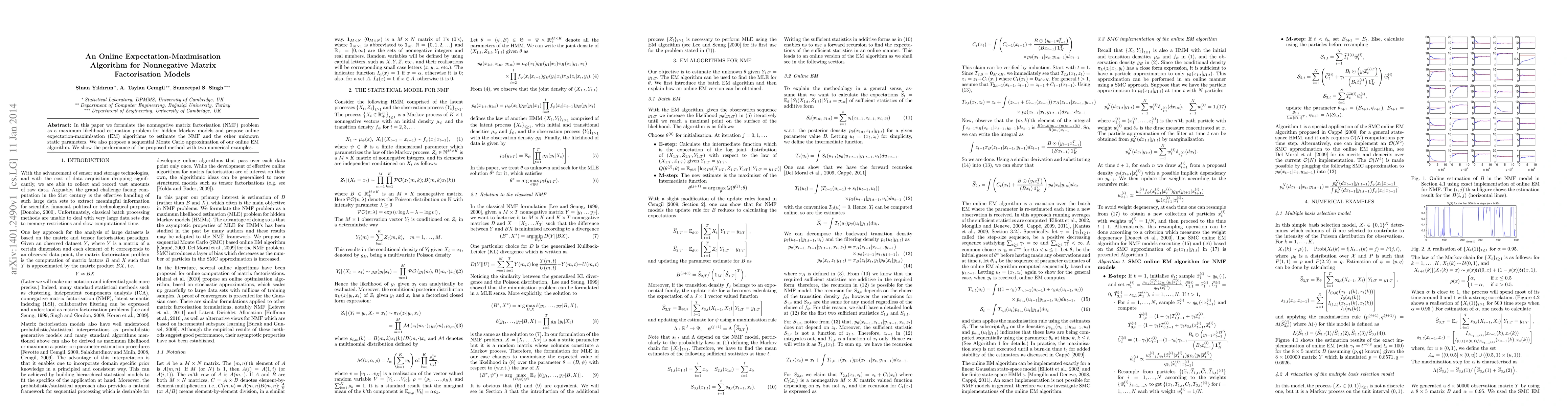 This paper proposes an online expectation-maximisation algorithm for estimating parameters in nonnegative matrix factorisation (NMF) models, framed as a maximum likelihood estimation problem for hidden Markov models. It also introduces a sequential Monte Carlo approximation and demonstrates its effectiveness through numerical examples.