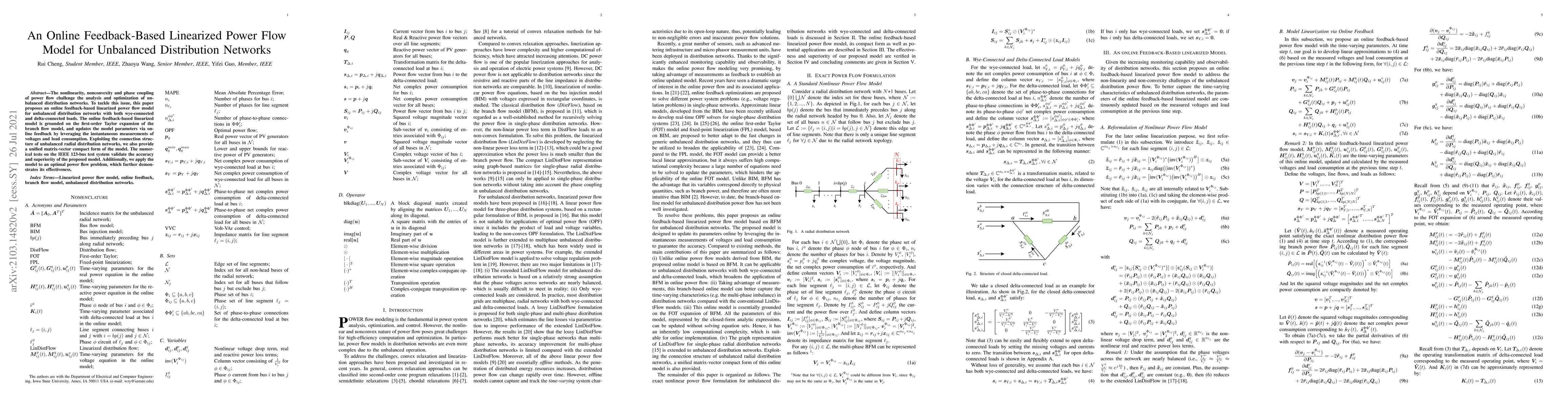 This paper proposes an online feedback-based linearized power flow model to address the complexities of unbalanced distribution networks, utilizing first-order Taylor expansion and real-time data to update model parameters, which enhances performance and mitigates mismatches. Numerical tests on the IEEE 123-bus system validate the model's effectiveness and superiority.