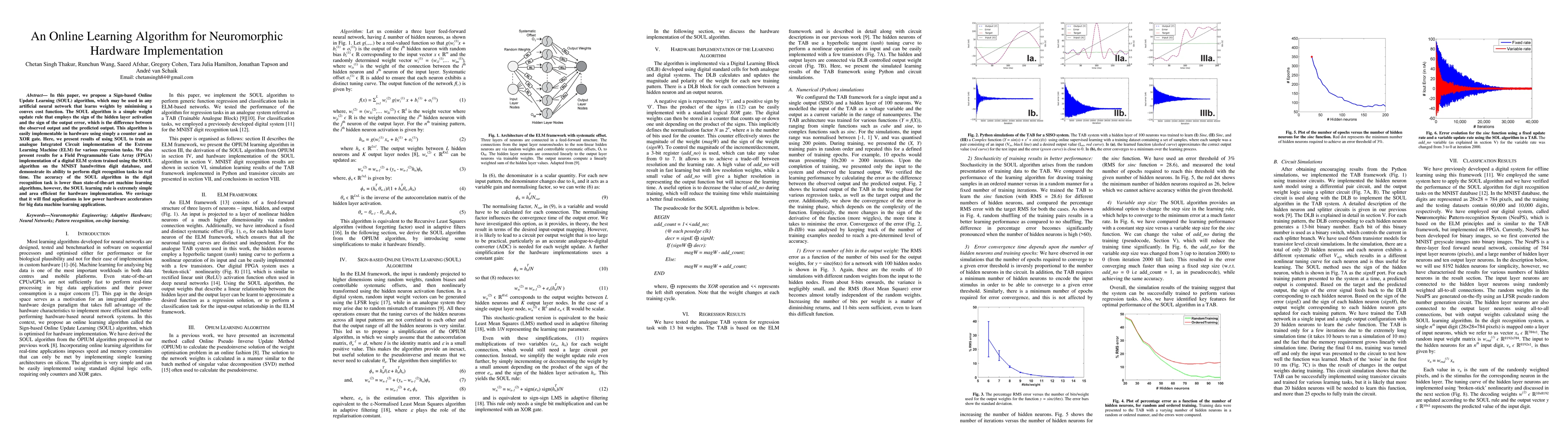 We propose a sign-based online learning (SOL) algorithm for a neuromorphic hardware framework called Trainable Analogue Block (TAB). The TAB framework utilises the principles of neural population coding, implying that it encodes the input stimulus using a large pool of nonlinear neurons. The SOL algorithm is a simple weight update rule that employs the sign of the hidden layer activation and the sign of the output error, which is the difference between the target output and the predicted output. The SOL algorithm is easily implementable in hardware, and can be used in any artificial neural network framework that learns weights by minimising a convex cost function. We show that the TAB framework can be trained for various regression tasks using the SOL algorithm.