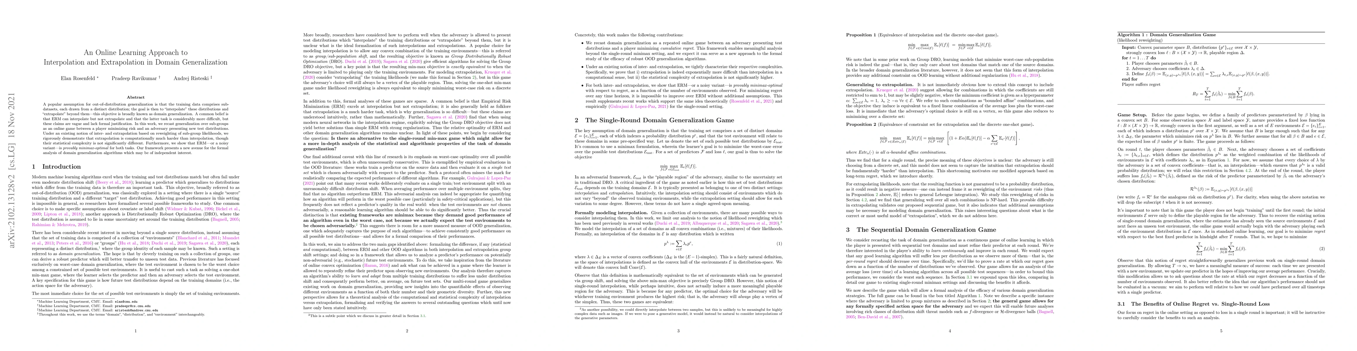 This paper formalizes domain generalization as an online game, demonstrating that extrapolation is computationally harder than interpolation, while Empirical Risk Minimization (ERM) is shown to be optimal for both tasks. The study provides a new framework for analyzing domain generalization algorithms.