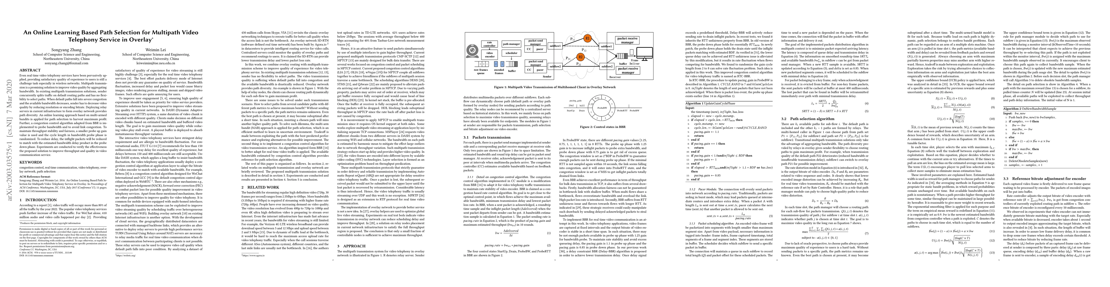 Even real time video telephony services have been pervasively applied, providing satisfactory quality of experience to users is still a challenge task especially in wireless networks. Multipath transmission is a promising solution to improve video quality by aggregating bandwidth. In existing multipath transmission solutions, sender concurrently splits traffic on default routing paths and has no flexibility to select paths. When default paths fall into severe congestion and the available bandwidth decreases, sender has to decrease video quality by reducing resolution or encoding bitrate. Deploying relay servers in current infrastructure to form overlay network provides path diversity. An online learning approach based on multi-armed bandits is applied for path selection to harvest maximum profit. Further, a congestion control algorithm adapted from BBR is implemented to probe bandwidth and to avoid link congestion. To maintain throughput stability and fairness, a smaller probe up gain value is used and the cycle length in bandwidth probe phase is randomized. To reduce delay, the inflight packets will be reduced to match with the estimated bandwidth delay product in the probe down phase. Experiments are conducted to verify the effectiveness the proposed solution to improve throughput and quality in video communication service.