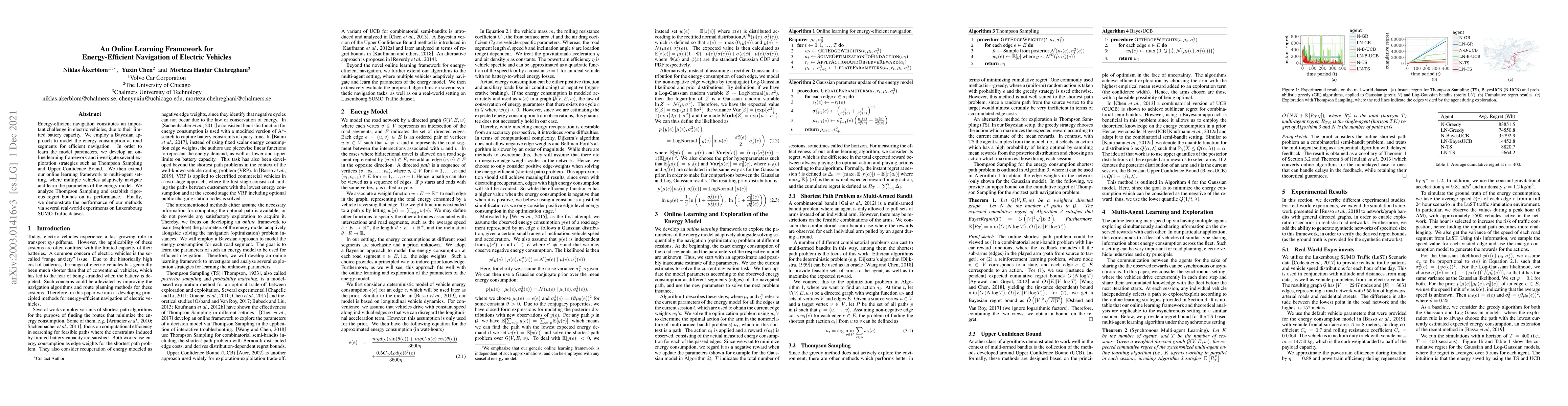 This paper proposes a Bayesian online learning framework for energy-efficient navigation in electric vehicles, utilizing Thompson Sampling and Upper Confidence Bound for model parameter learning. The framework is extended to a multi-agent setting, with rigorous regret bounds established for Thompson Sampling, and validated through real-world experiments on the Luxembourg SUMO Traffic dataset.