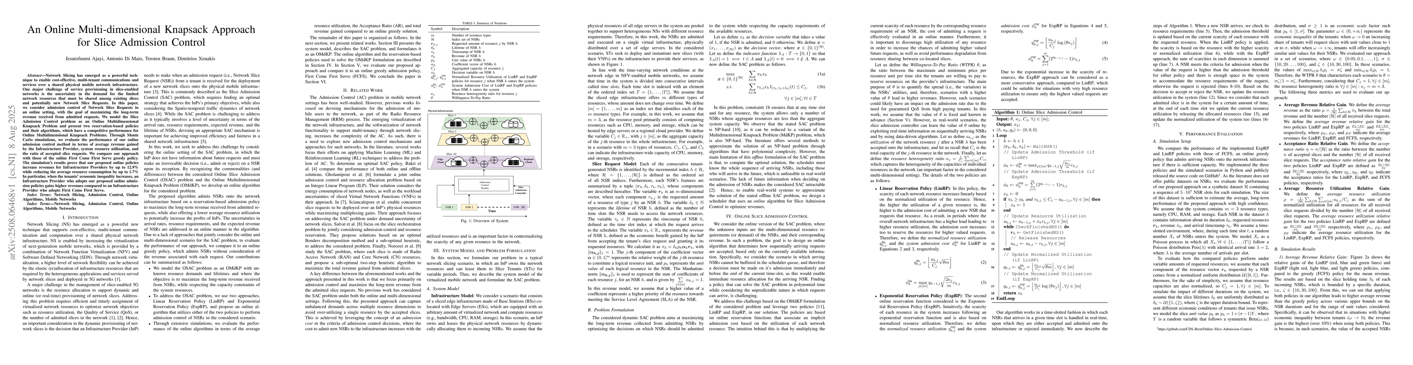 Network Slicing has emerged as a powerful technique to enable cost-effective, multi-tenant communications and services over a shared physical mobile network infrastructure. One major challenge of service provisioning in slice-enabled networks is the uncertainty in the demand for the limited network resources that must be shared among existing slices and potentially new Network Slice Requests. In this paper, we consider admission control of Network Slice Requests in an online setting, with the goal of maximizing the long-term revenue received from admitted requests. We model the Slice Admission Control problem as an Online Multidimensional Knapsack Problem and present two reservation-based policies and their algorithms, which have a competitive performance for Online Multidimensional Knapsack Problems. Through Monte Carlo simulations, we evaluate the performance of our online admission control method in terms of average revenue gained by the Infrastructure Provider, system resource utilization, and the ratio of accepted slice requests. We compare our approach with those of the online First Come First Serve greedy policy. The simulation's results prove that our proposed online policies increase revenues for Infrastructure Providers by up to 12.9 % while reducing the average resource consumption by up to 1.7% In particular, when the tenants' economic inequality increases, an Infrastructure Provider who adopts our proposed online admission policies gains higher revenues compared to an Infrastructure Provider who adopts First Come First Serve.