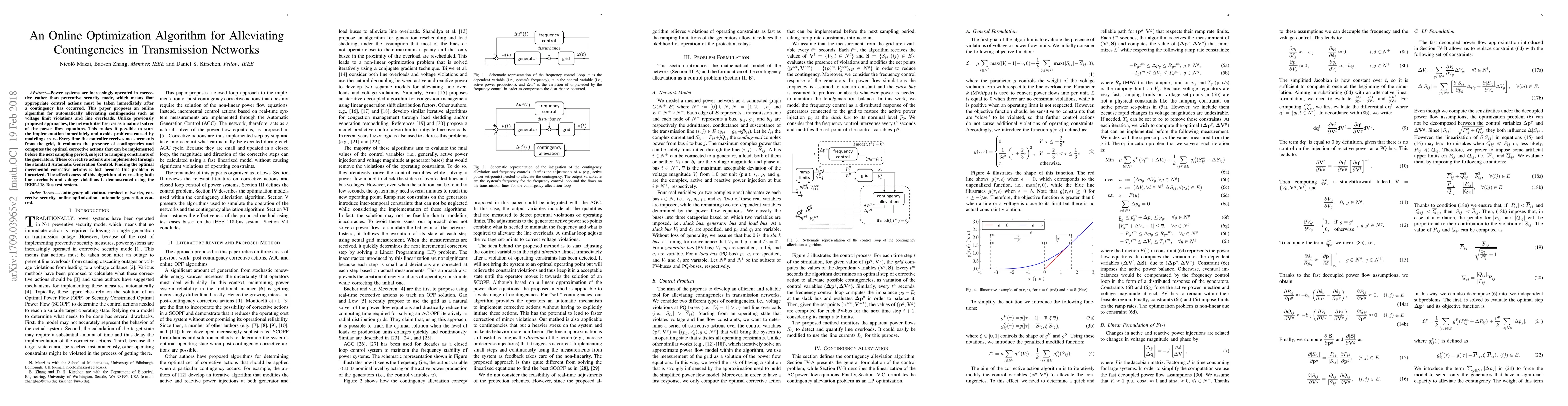 Power systems are increasingly operated in corrective rather than preventive security mode, which means that appropriate control actions must be taken immediately after a contingency has occurred. This paper proposes an online algorithm for automatically alleviating contingencies such as voltage limit violations and line overloads. Unlike previously proposed approaches, the network itself serves as a natural solver of the power flow equations. This makes it possible to start the implementation immediately and avoids problems caused by modeling errors. Every time the controller receives measurements from the grid, it evaluates the presence of contingencies and computes the optimal corrective actions that can be implemented before the next sampling period, subject to ramping constraints of the generators. These corrective actions are implemented through the standard Automatic Generation Control. Finding the optimal incremental corrective actions is fast because this problem is linearized. The effectiveness of this algorithm at correcting both line overloads and voltage violations is demonstrated using the IEEE-118 Bus test system.