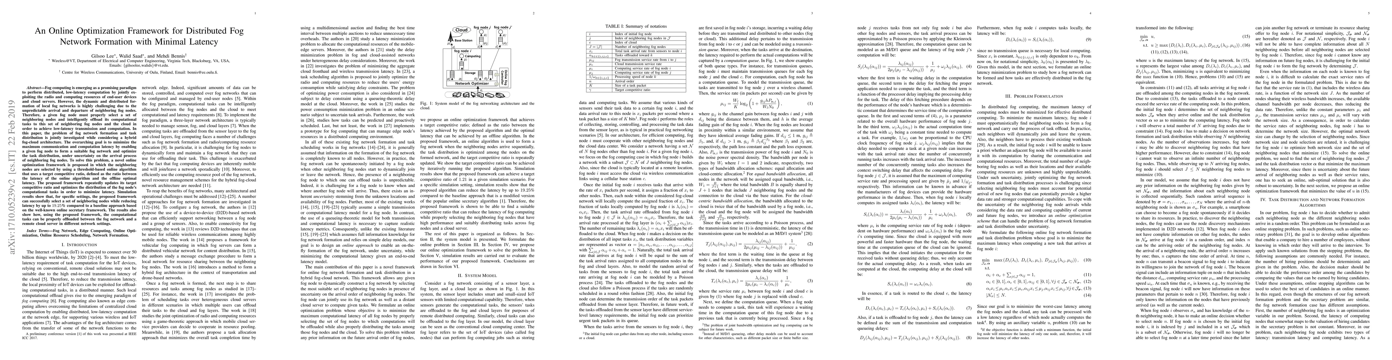 A new online optimization framework is proposed to minimize latency in fog network formation and task distribution, reducing latency by up to 19.25% compared to baseline approaches.
