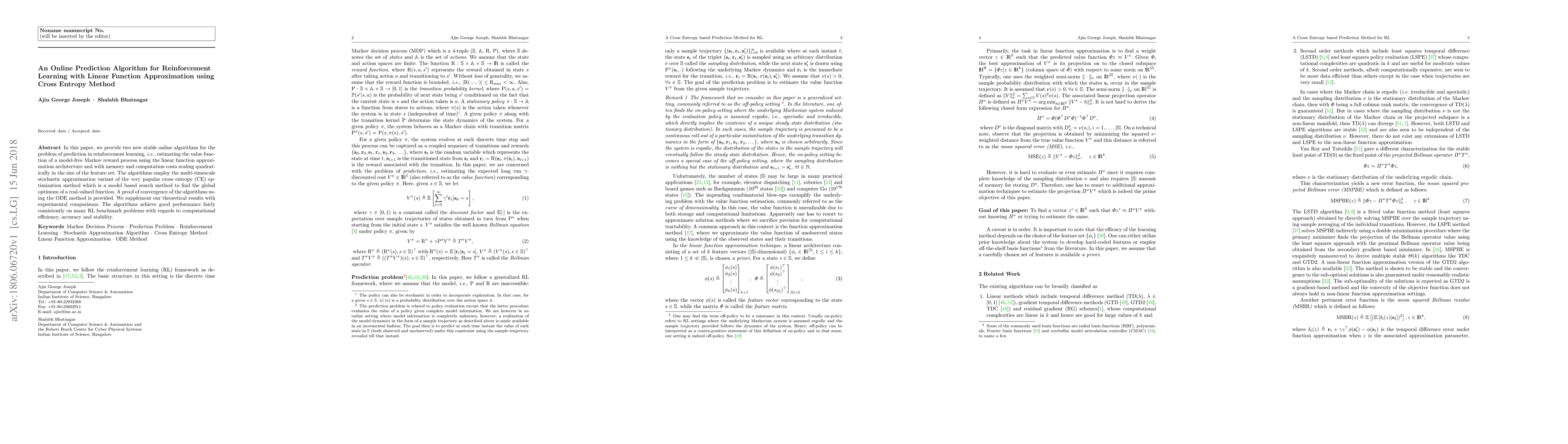 This paper presents two online algorithms for reinforcement learning value function prediction using linear function approximation and cross entropy method. The algorithms demonstrate convergence and perform well on benchmarks for computational efficiency, accuracy, and stability.
