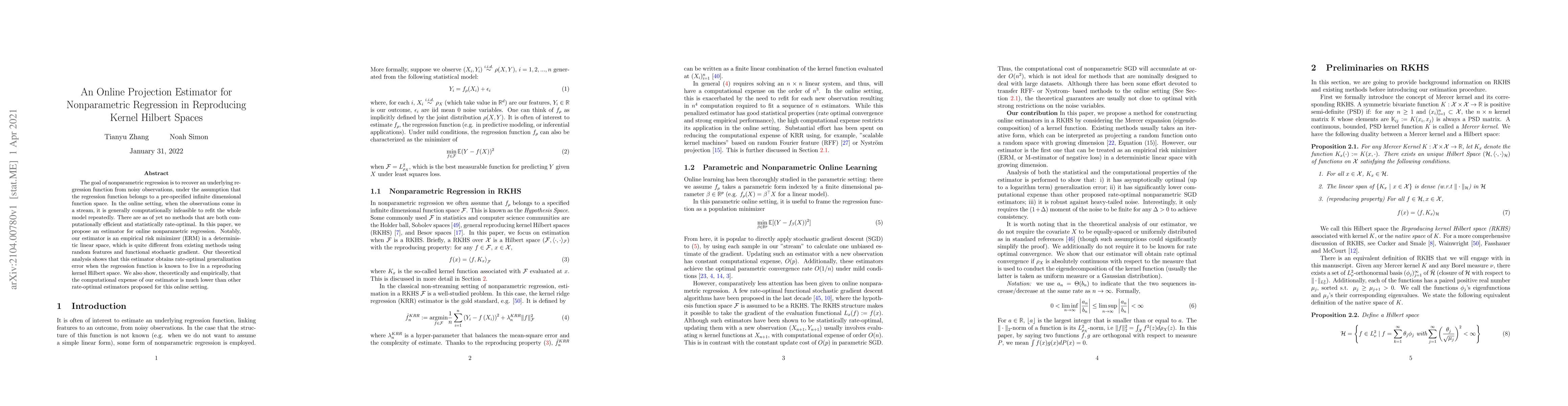 This paper proposes an efficient online estimator for nonparametric regression in reproducing kernel Hilbert spaces, achieving rate-optimal generalization error while significantly reducing computational costs compared to existing methods. The estimator is an empirical risk minimizer in a deterministic linear space, differing from methods using random features.