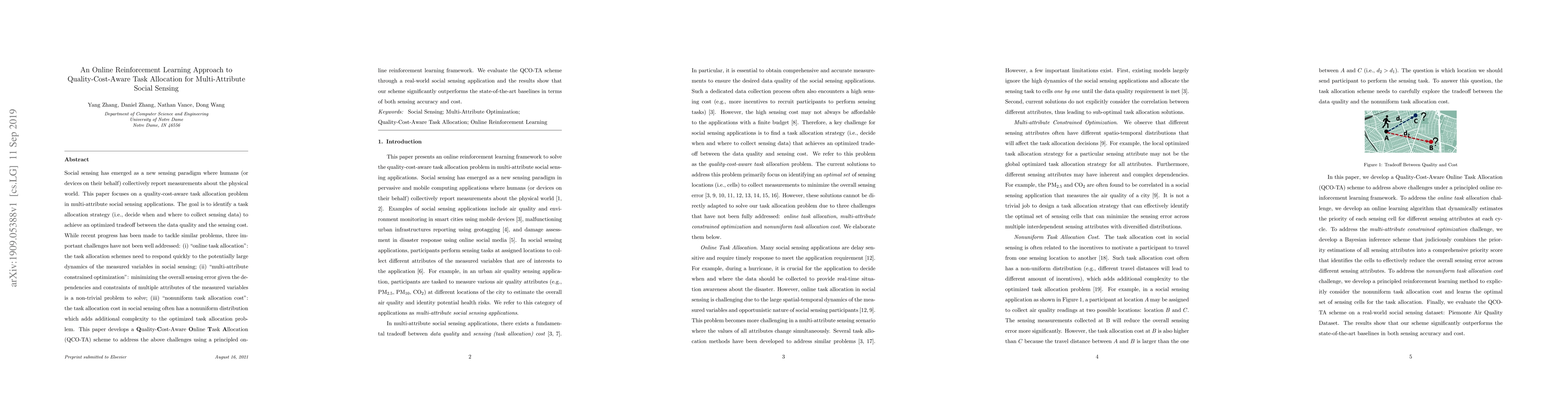 This paper proposes an online reinforcement learning approach, QCO-TA, to optimize task allocation in multi-attribute social sensing by balancing data quality and cost. It addresses challenges in online adaptability, multi-attribute optimization, and nonuniform task allocation costs, outperforming existing methods in accuracy and cost efficiency.