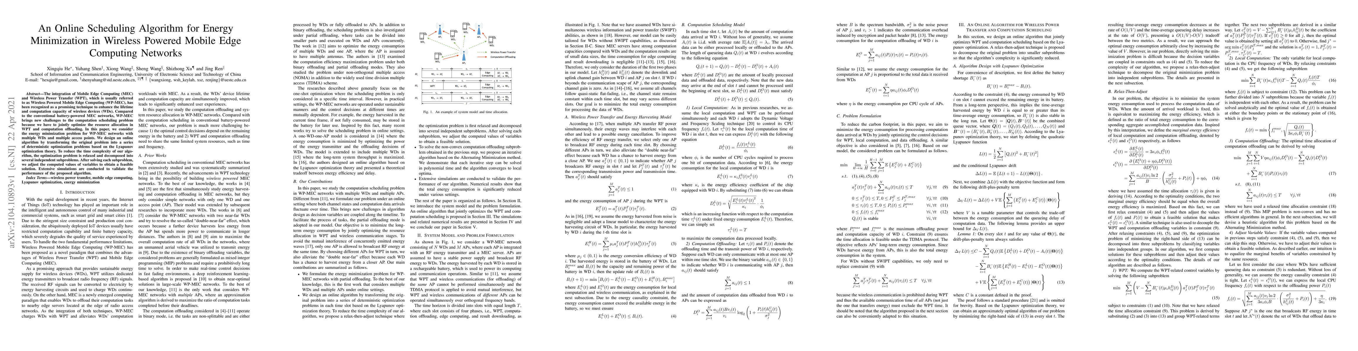 This paper proposes an online scheduling algorithm for minimizing energy consumption in Wireless Powered Mobile Edge Computing (WP-MEC) networks. The algorithm transforms the energy minimization problem into a series of deterministic optimization problems using Lyapunov optimization theory, decomposes it into independent subproblems, and validates its performance through extensive simulations.