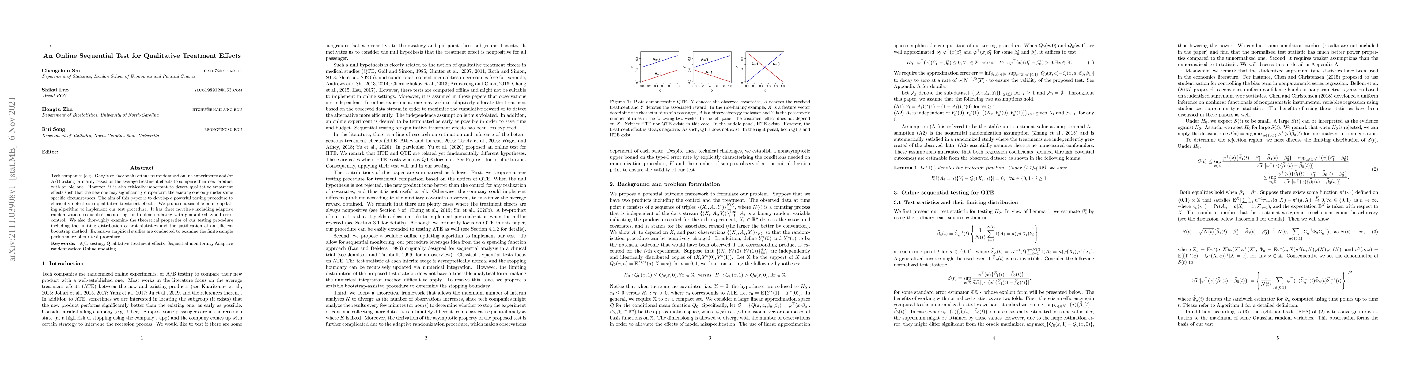 Tech companies (e.g., Google or Facebook) often use randomized online experiments and/or A/B testing primarily based on the average treatment effects to compare their new product with an old one. However, it is also critically important to detect qualitative treatment effects such that the new one may significantly outperform the existing one only under some specific circumstances. The aim of this paper is to develop a powerful testing procedure to efficiently detect such qualitative treatment effects. We propose a scalable online updating algorithm to implement our test procedure. It has three novelties including adaptive randomization, sequential monitoring, and online updating with guaranteed type-I error control. We also thoroughly examine the theoretical properties of our testing procedure including the limiting distribution of test statistics and the justification of an efficient bootstrap method. Extensive empirical studies are conducted to examine the finite sample performance of our test procedure.
