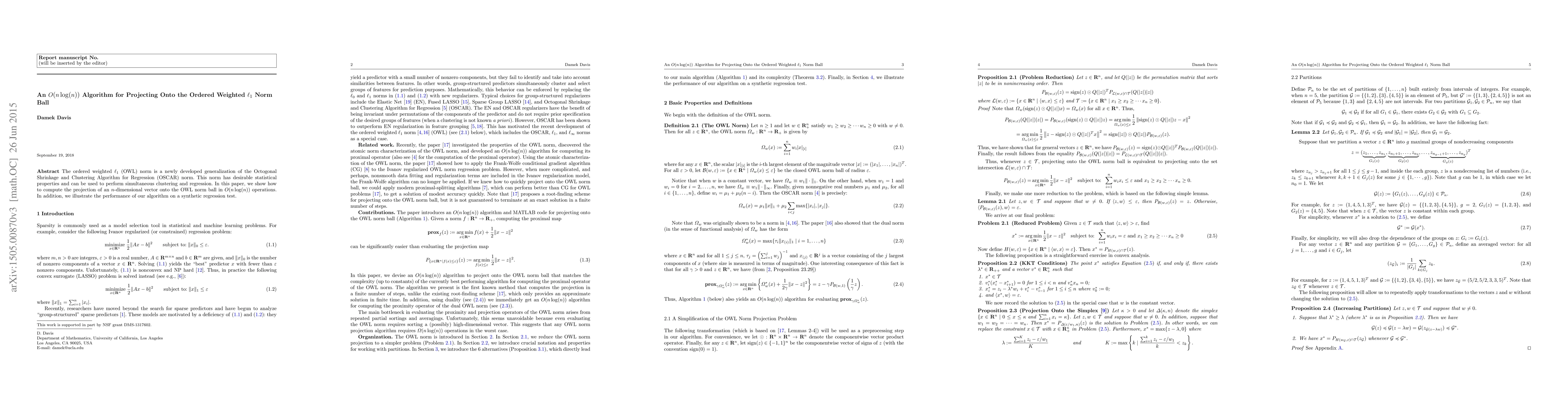 This paper presents an efficient $O(n\log(n))$ algorithm for projecting vectors onto the ordered weighted $\ell_1$ (OWL) norm ball, a generalization of the OSCAR norm, and demonstrates its performance through a synthetic regression test.