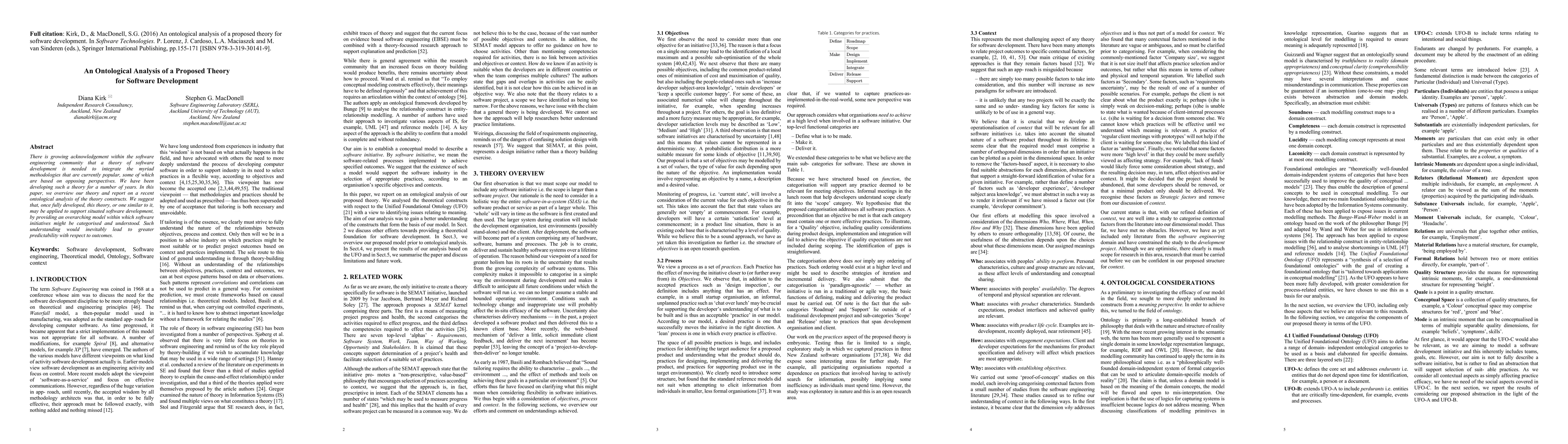 This paper presents an ontological analysis of a proposed theory for software development, aiming to unify various methodologies. The authors suggest that this theory could provide a comprehensive model to categorize and predict software development outcomes, enhancing predictability and integration of diverse practices.