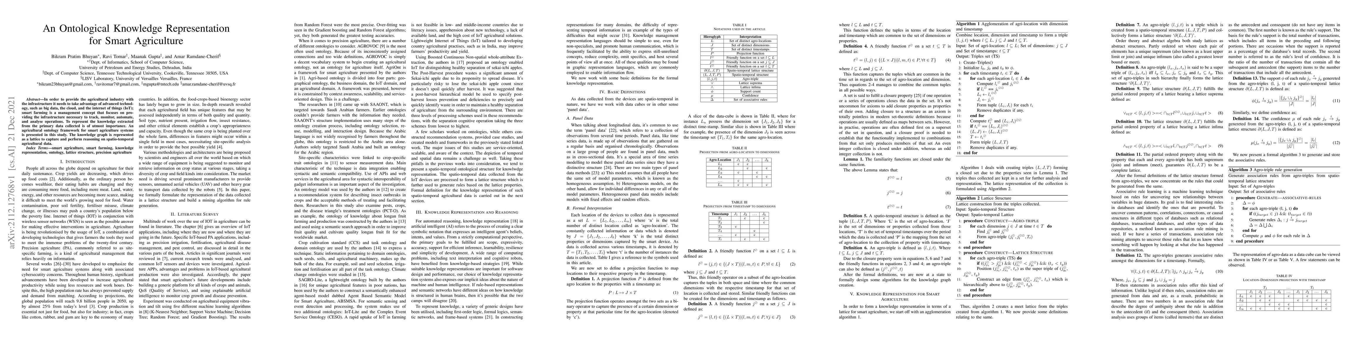 The paper presents an ontological knowledge representation for smart agriculture using a lattice structure to capture and perform reasoning on spatio-temporal agricultural data. It involves creating agro-triples from IoT data, forming a spatio-temporal lattice, and generating associative rules for reasoning.