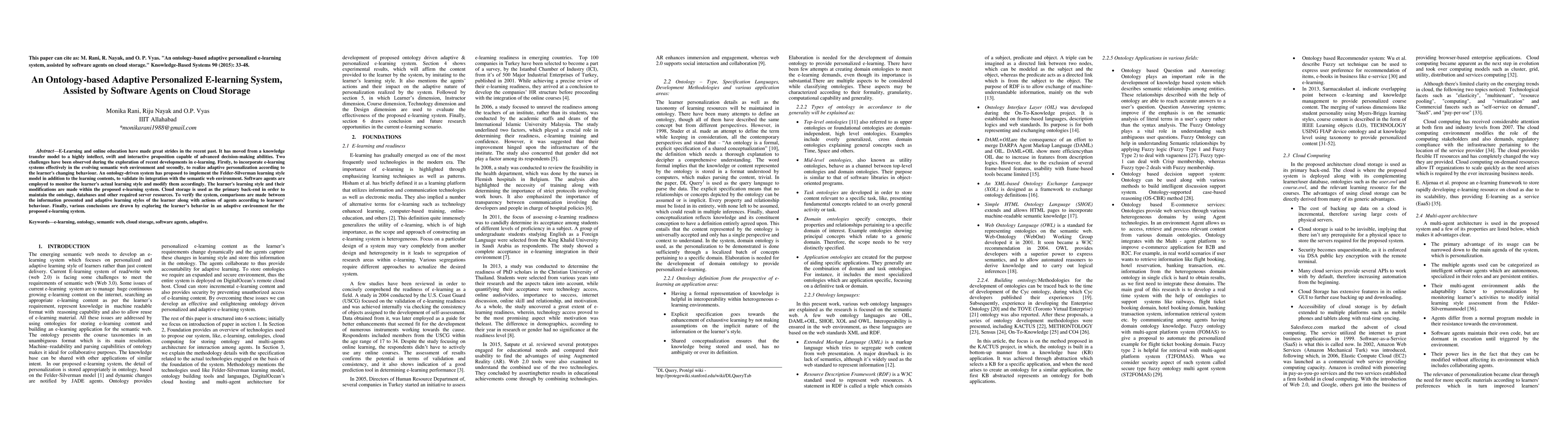 A research paper proposes an ontology-based adaptive personalized e-learning system using software agents on cloud storage to address challenges in incorporating e-learning systems into the evolving semantic web environment and realizing adaptive personalization according to learner behavior.
