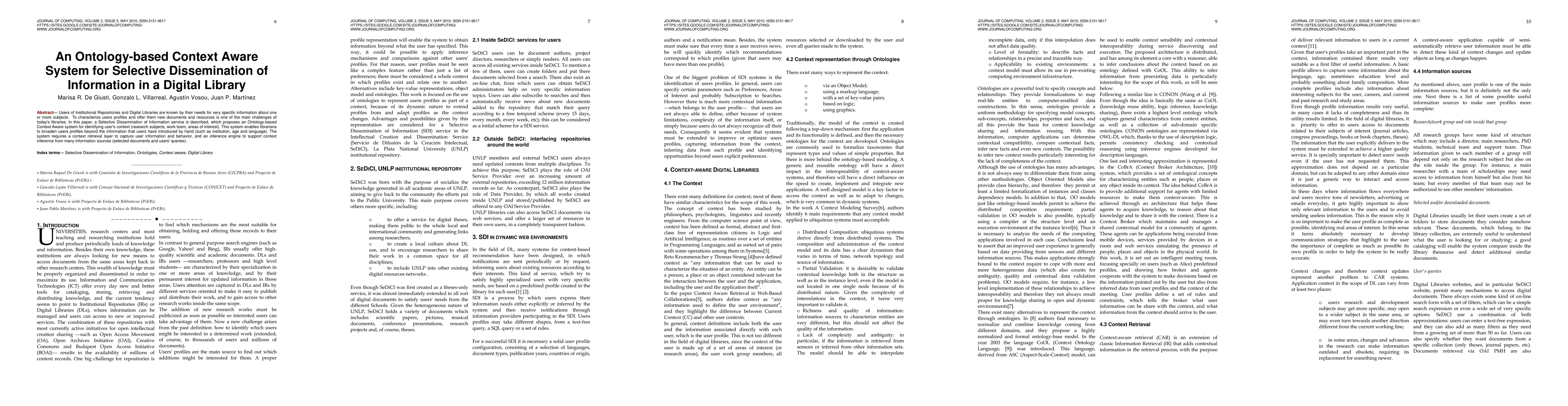This paper proposes an Ontology-based Context Aware system for a Selective Dissemination of Information service in Digital Libraries, enhancing user profiles through automated context inference from user behavior and information sources. The system aims to provide more specific documents and resources to users based on their research subjects and interests.