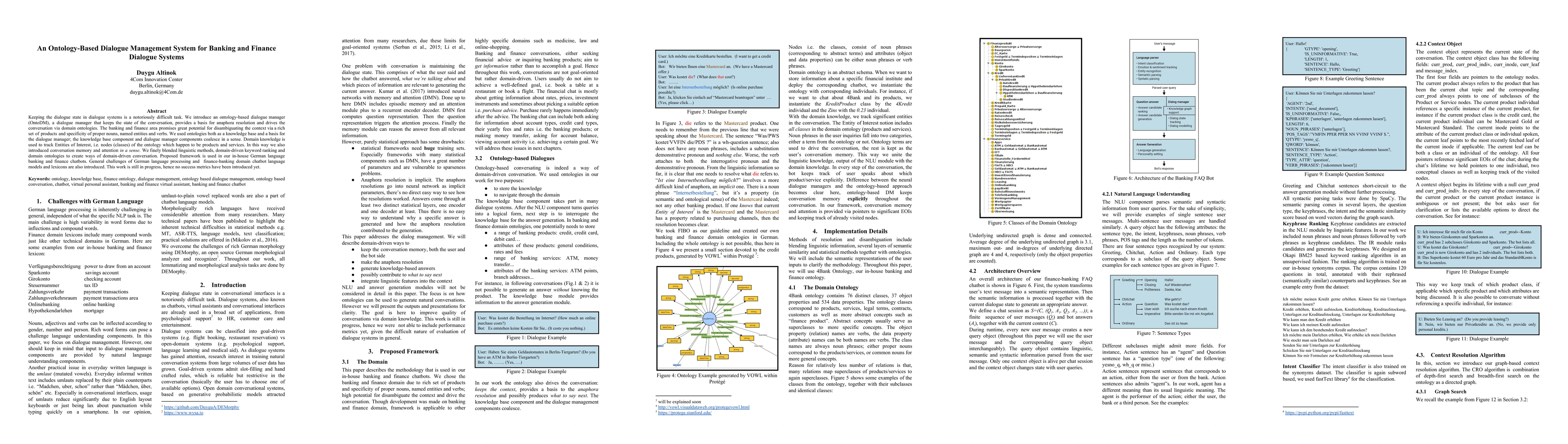 This paper introduces OntoDM, an ontology-based dialogue management system for banking and finance, which uses domain ontologies to track conversation state and resolve anaphora. The system blends linguistic methods and domain-driven keyword ranking to facilitate domain-specific conversations, with ongoing development and no current success metrics.