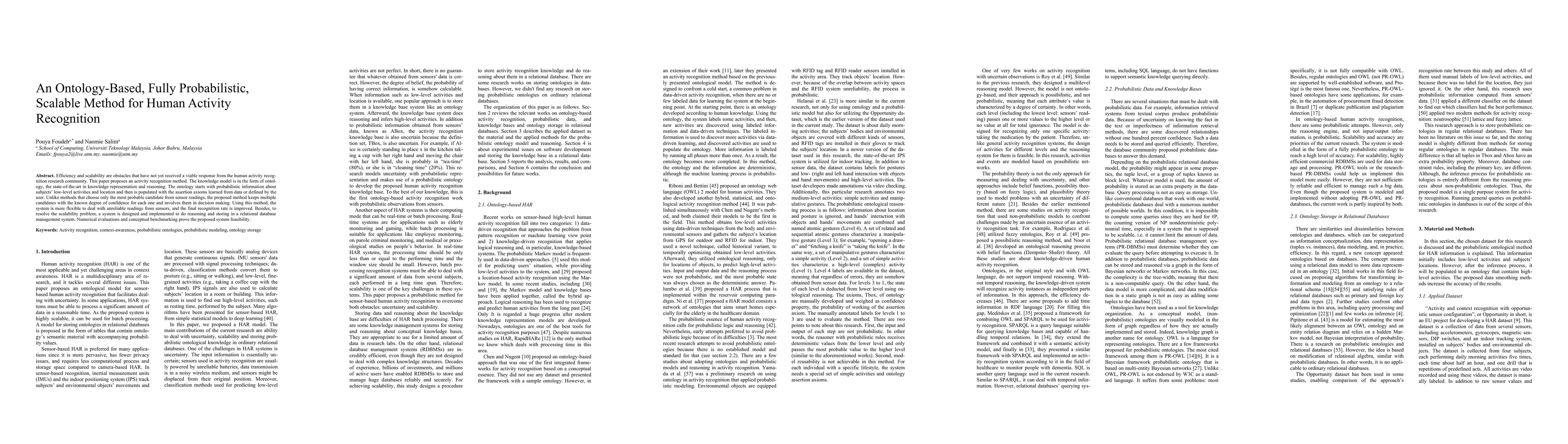 Efficiency and scalability are obstacles that have not yet received a viable response from the human activity recognition research community. This paper proposes an activity recognition method. The knowledge model is in the form of ontology, the state-of-the-art in knowledge representation and reasoning. The ontology starts with probabilistic information about subjects' low-level activities and location and then is populated with the assertion axioms learned from data or defined by the user. Unlike methods that choose only the most probable candidate from sensor readings, the proposed method keeps multiple candidates with the known degree of confidence for each one and involves them in decision making. Using this method, the system is more flexible to deal with unreliable readings from sensors, and the final recognition rate is improved. Besides, to resolve the scalability problem, a system is designed and implemented to do reasoning and storing in a relational database management system. Numerical evaluation and conceptual benchmarking prove the proposed system feasibility.