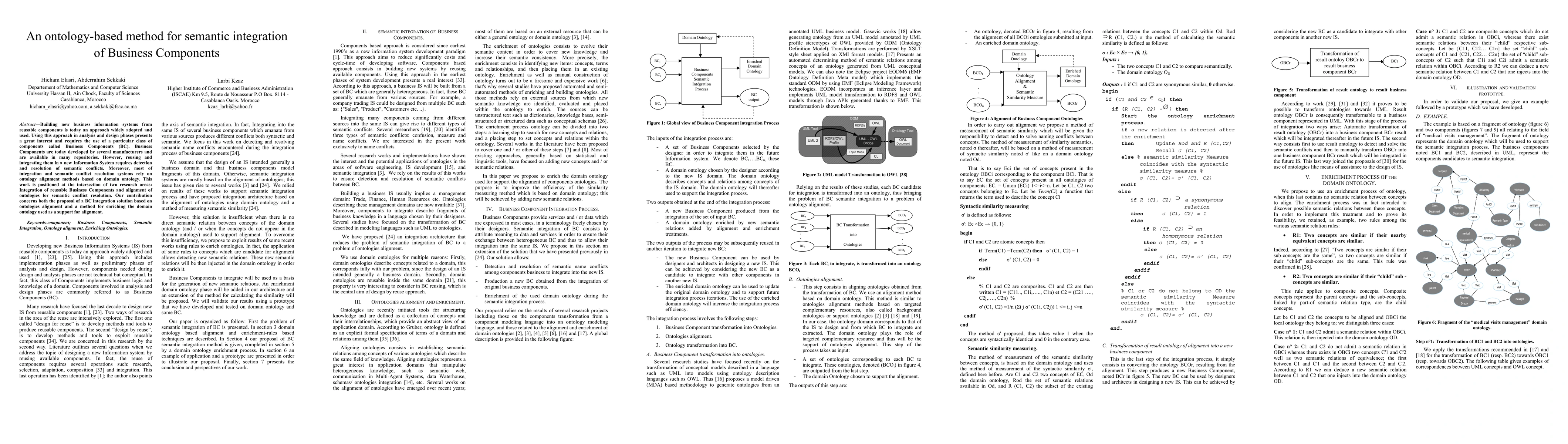 This paper proposes an ontology-based method for integrating reusable Business Components by aligning domain ontologies to resolve semantic conflicts, and it introduces a technique for enriching the domain ontology to support this alignment.
