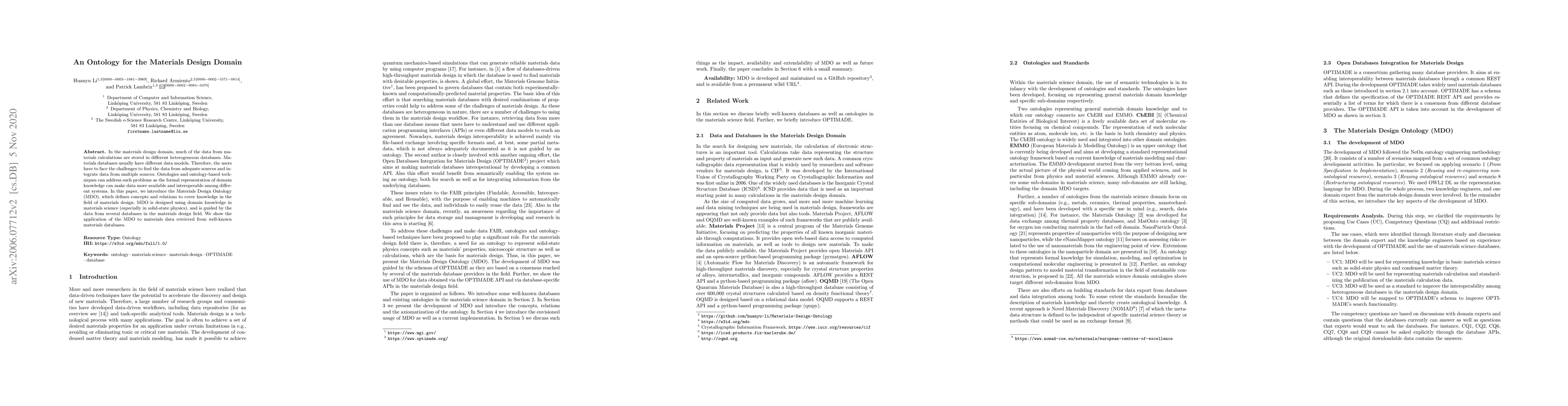 In the materials design domain, much of the data from materials calculations are stored in different heterogeneous databases. Materials databases usually have different data models. Therefore, the users have to face the challenges to find the data from adequate sources and integrate data from multiple sources. Ontologies and ontology-based techniques can address such problems as the formal representation of domain knowledge can make data more available and interoperable among different systems. In this paper, we introduce the Materials Design Ontology (MDO), which defines concepts and relations to cover knowledge in the field of materials design. MDO is designed using domain knowledge in materials science (especially in solid-state physics), and is guided by the data from several databases in the materials design field. We show the application of the MDO to materials data retrieved from well-known materials databases.