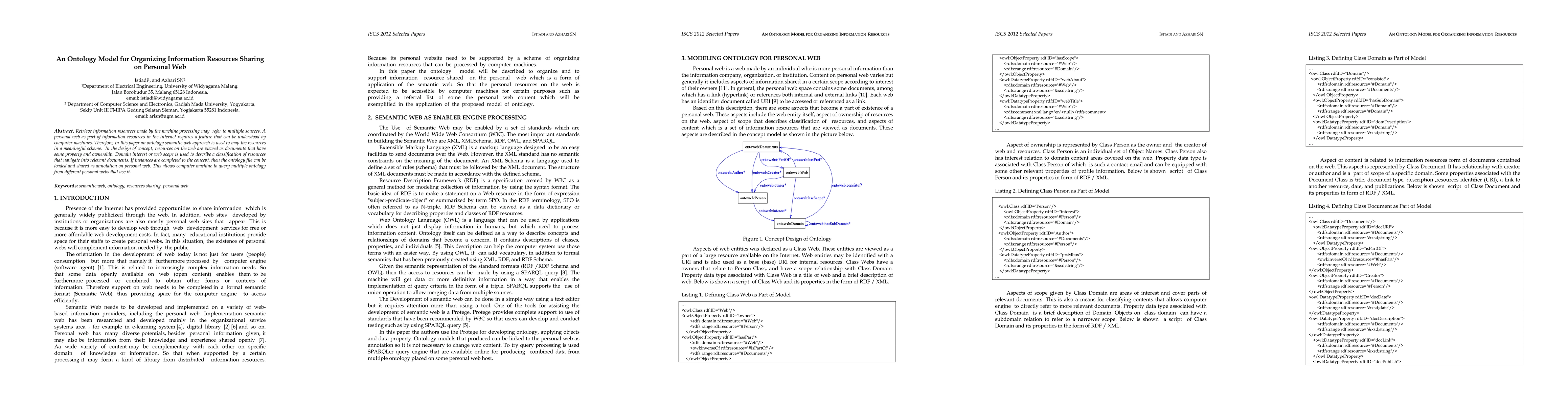 This paper proposes an ontology model using semantic web techniques to organize and share information resources on personal webs. It maps resources into a meaningful scheme based on properties and ownership, enabling machine-based retrieval across different personal webs.