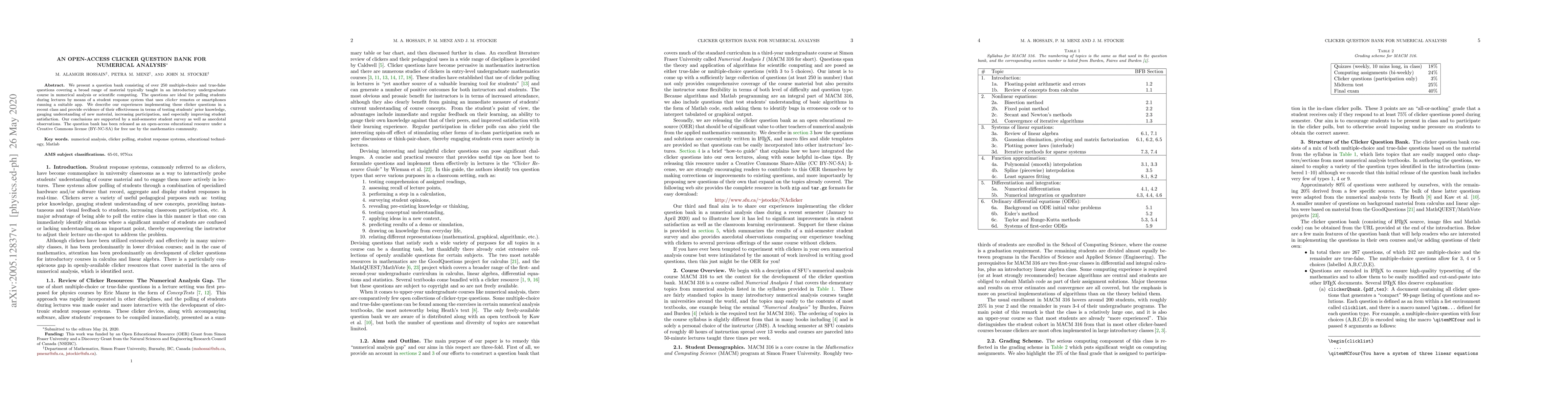 We present a question bank consisting of over 250 multiple-choice and true-false questions covering a broad range of material typically taught in an introductory undergraduate course in numerical analysis or scientific computing. The questions are ideal for polling students during lectures by means of a student response system that uses clicker remotes or smartphones running a suitable app. We describe our experiences implementing these clicker questions in a recent class and provide evidence of their effectiveness in terms of testing students' prior knowledge, gauging understanding of new material, increasing participation, and especially improving student satisfaction. Our conclusions are supported by a mid-semester student survey as well as anecdotal observations. The question bank has been released as an open-access educational resource under a Creative Commons license (BY-NC-SA) for free use by the mathematics community.