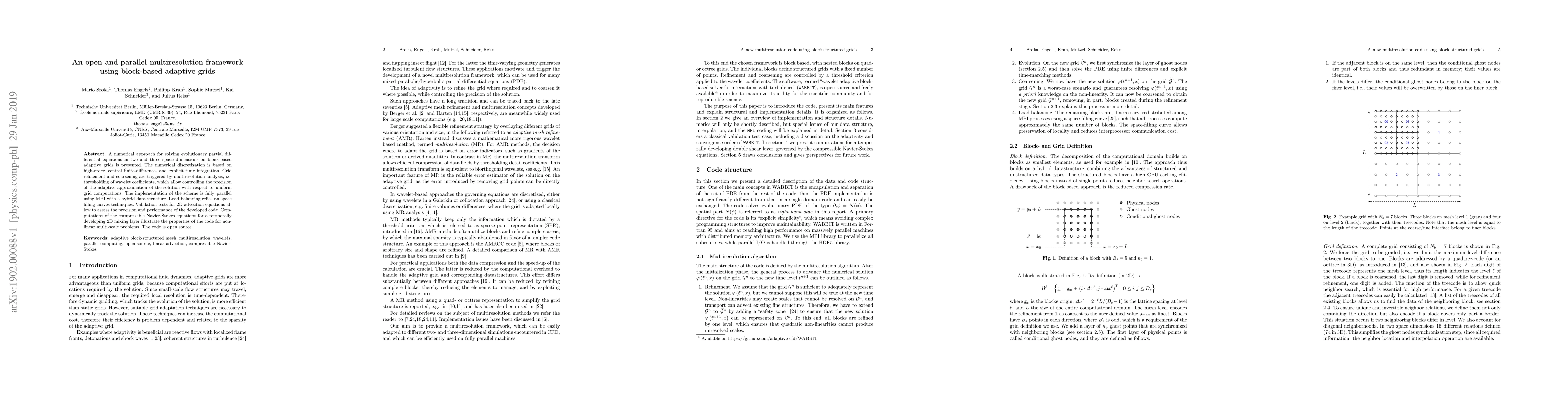 A numerical approach for solving evolutionary partial differential equations in two and three space dimensions on block-based adaptive grids is presented. The numerical discretization is based on high-order, central finite-differences and explicit time integration. Grid refinement and coarsening are triggered by multiresolution analysis, i.e. thresholding of wavelet coefficients, which allow controlling the precision of the adaptive approximation of the solution with respect to uniform grid computations. The implementation of the scheme is fully parallel using MPI with a hybrid data structure. Load balancing relies on space filling curves techniques. Validation tests for 2D advection equations allow to assess the precision and performance of the developed code. Computations of the compressible Navier-Stokes equations for a temporally developing 2D mixing layer illustrate the properties of the code for nonlinear multi-scale problems. The code is open source.