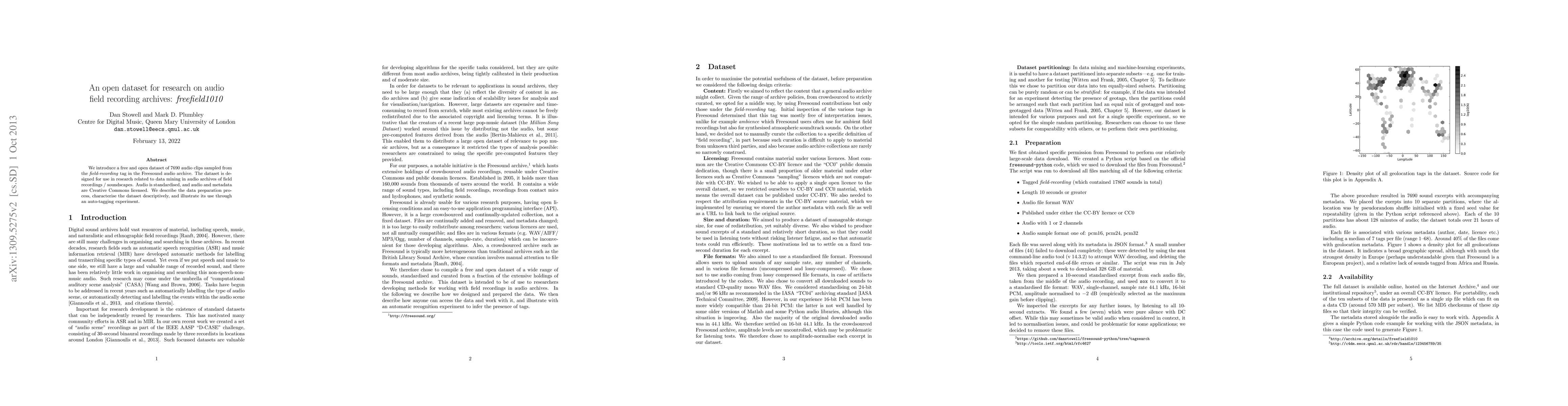 We introduce a free and open dataset of 7690 audio clips sampled from the field-recording tag in the Freesound audio archive. The dataset is designed for use in research related to data mining in audio archives of field recordings / soundscapes. Audio is standardised, and audio and metadata are Creative Commons licensed. We describe the data preparation process, characterise the dataset descriptively, and illustrate its use through an auto-tagging experiment.